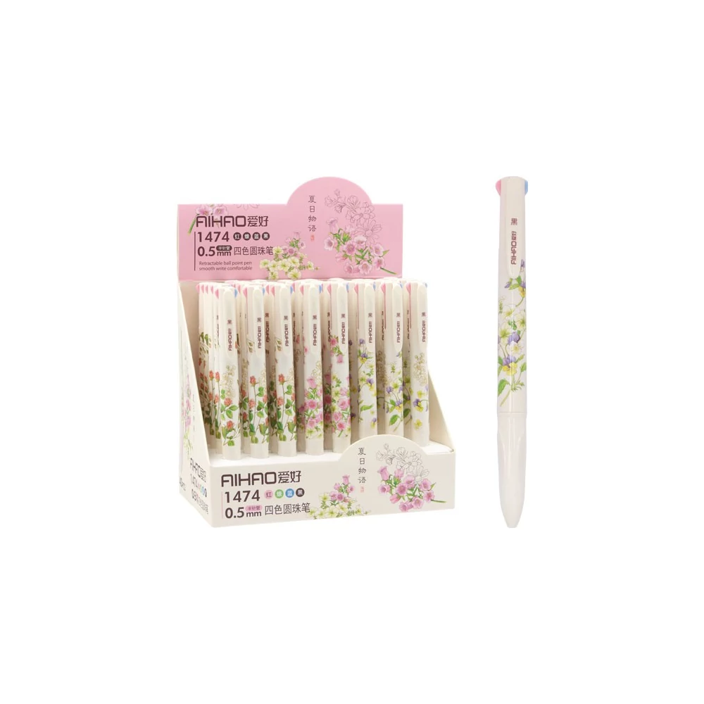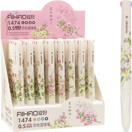 - 0. 5 mm-es vonalvastagság. - 4 funkciós golyóstoll: kék, piros, fekete és zöld színnel ír. - Műanyag test. - 3 féle virág mintával . A minta a megjegyzésben a készlet erejéig választható. minták: árvácska , rózsa ,bimbós rózsa . Az ár 1db tollra vonatkozik.