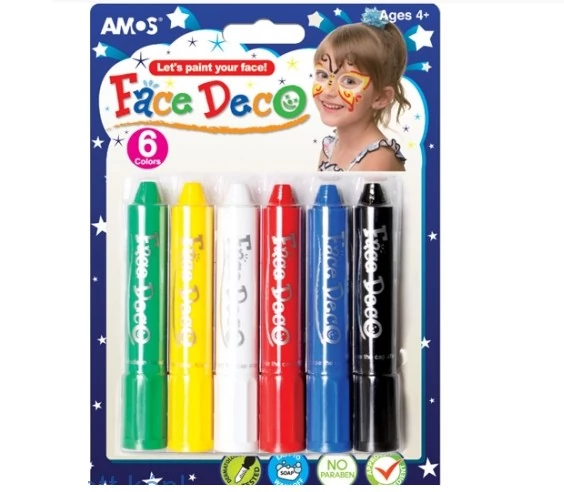 - Amos arcfesték készlet bliszterben, 6 szín - Arc és kéz festésére alkalmas bőrbarát festék. Szappanos vízzel lemosható. A kicsavarható festékstiftet műanyag borítás védi a töredezéstől és a szennyeződéstől. Az arcfestés minden eseményt feldob, legyen az születésnap, farsangi mulatság vagy egy focimeccs!