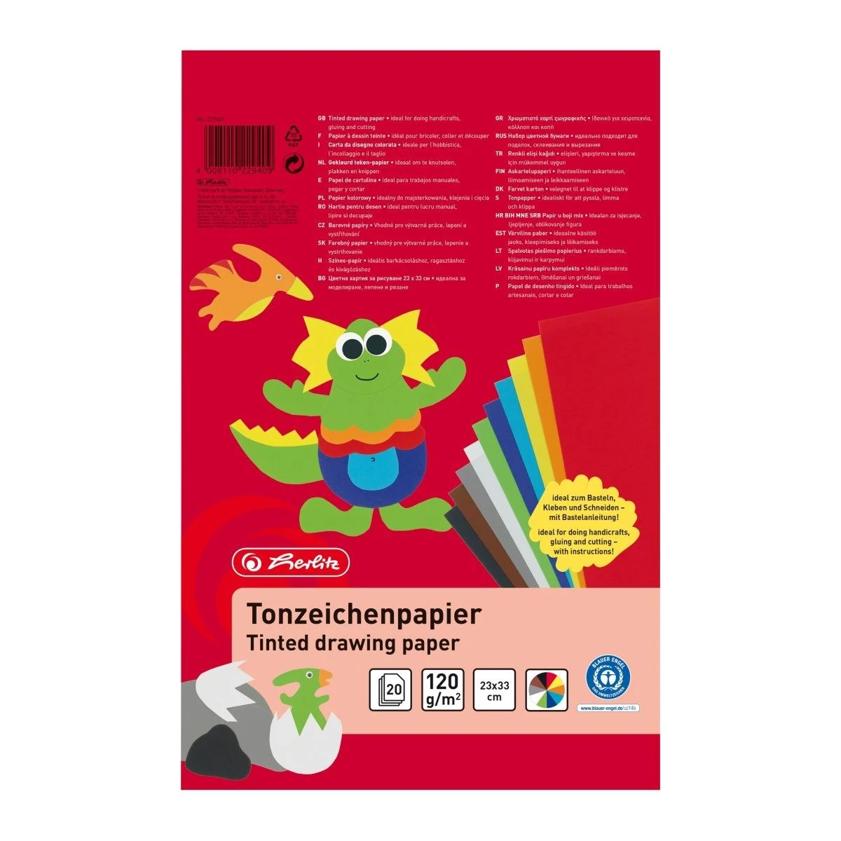 Barkácskarton 33x23 cm-es méretben, 20 ív/csomag, 120g/m2-es kartonból, 10 különböző színben, 2 db#slszín/csomag, Blauer Engel környezetbarát minősítéssel.