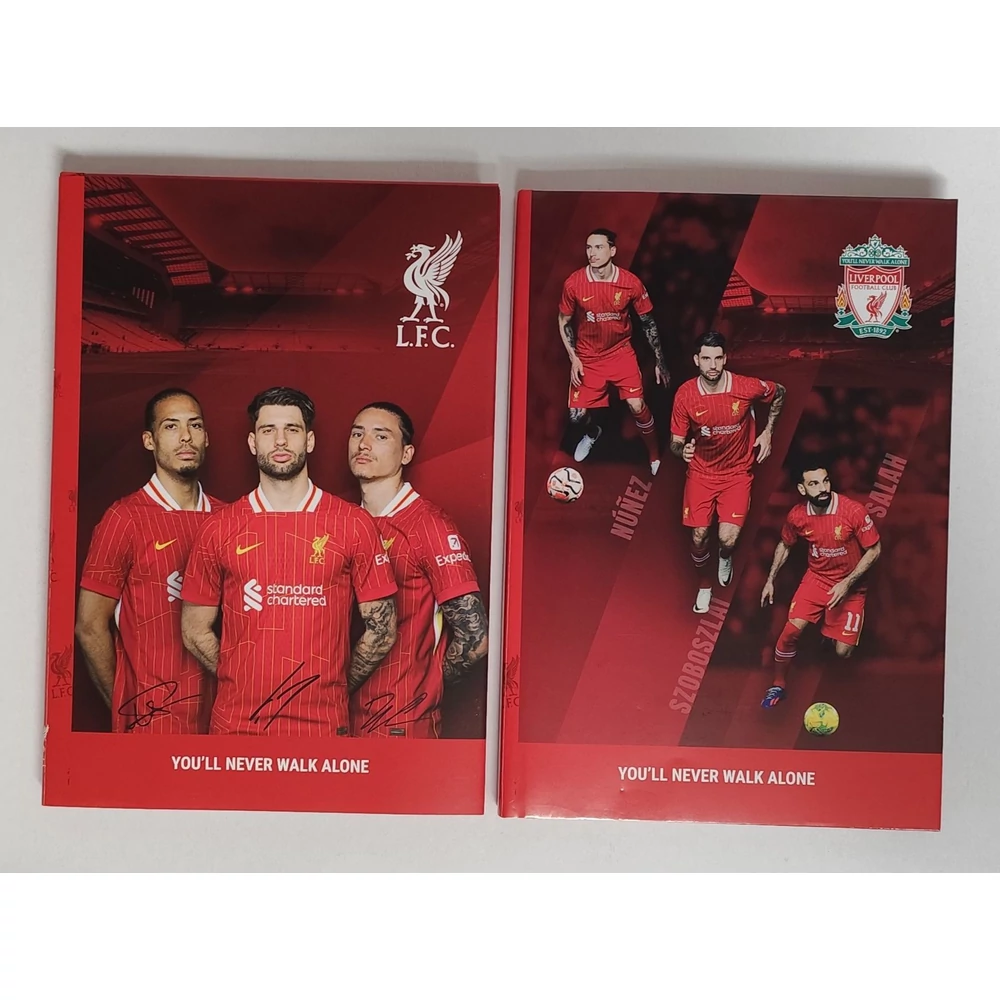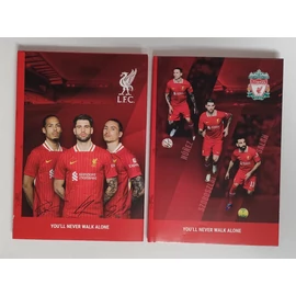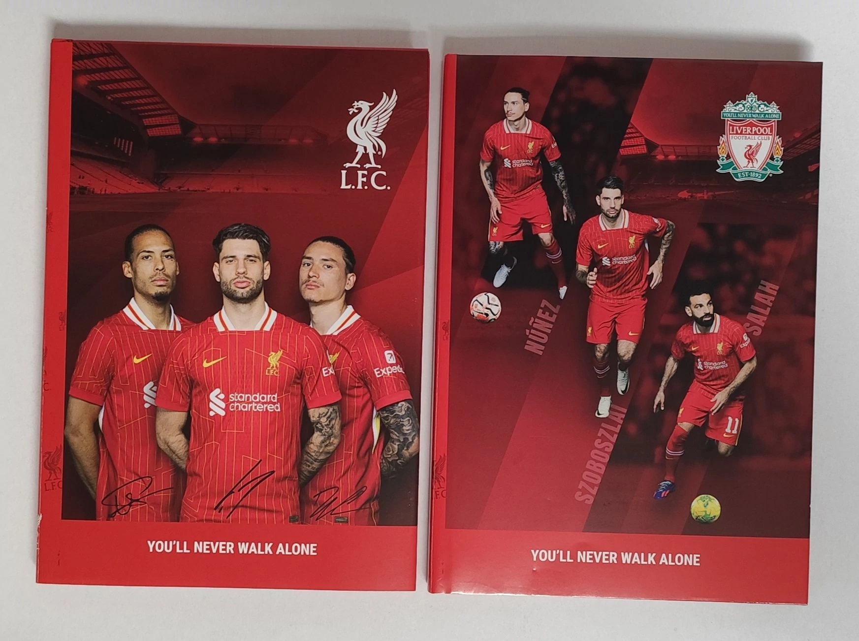 A5 méretű, keményfedeles, vonalas beírófüzet, Liverpool FC motívumokkal, külön papírborítóval.