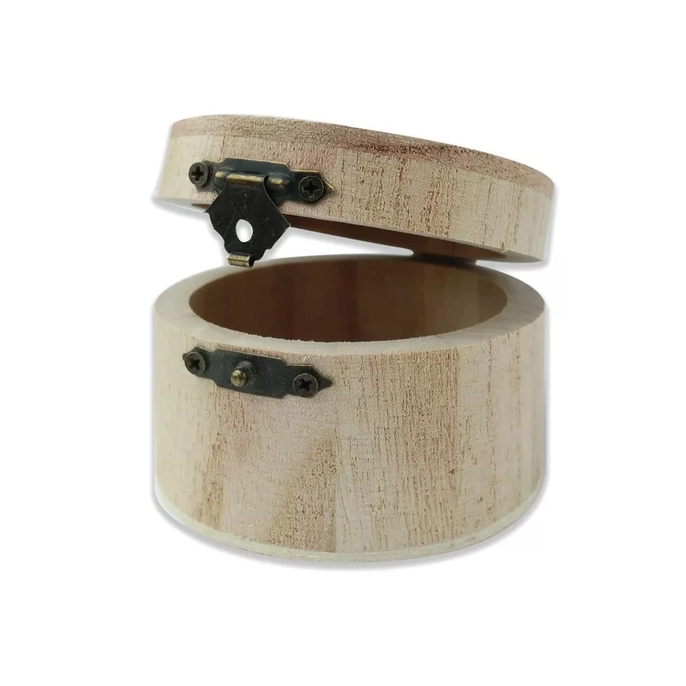 A csatos fadoboz kör alakú, melynek mérete: 8x5 cm