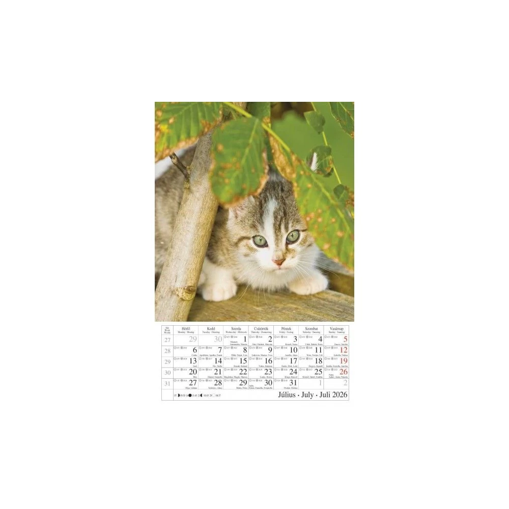6 lapos , átfordítós álló formátumú, magyar, német és angol nyelvű spirálozott falinaptár, napkelte, napnyugta és holdállás feltüntetésével. Magyar ünnepeket és névnapokat tartalmaz. Mérete: 21x32 cm