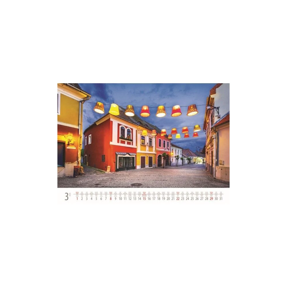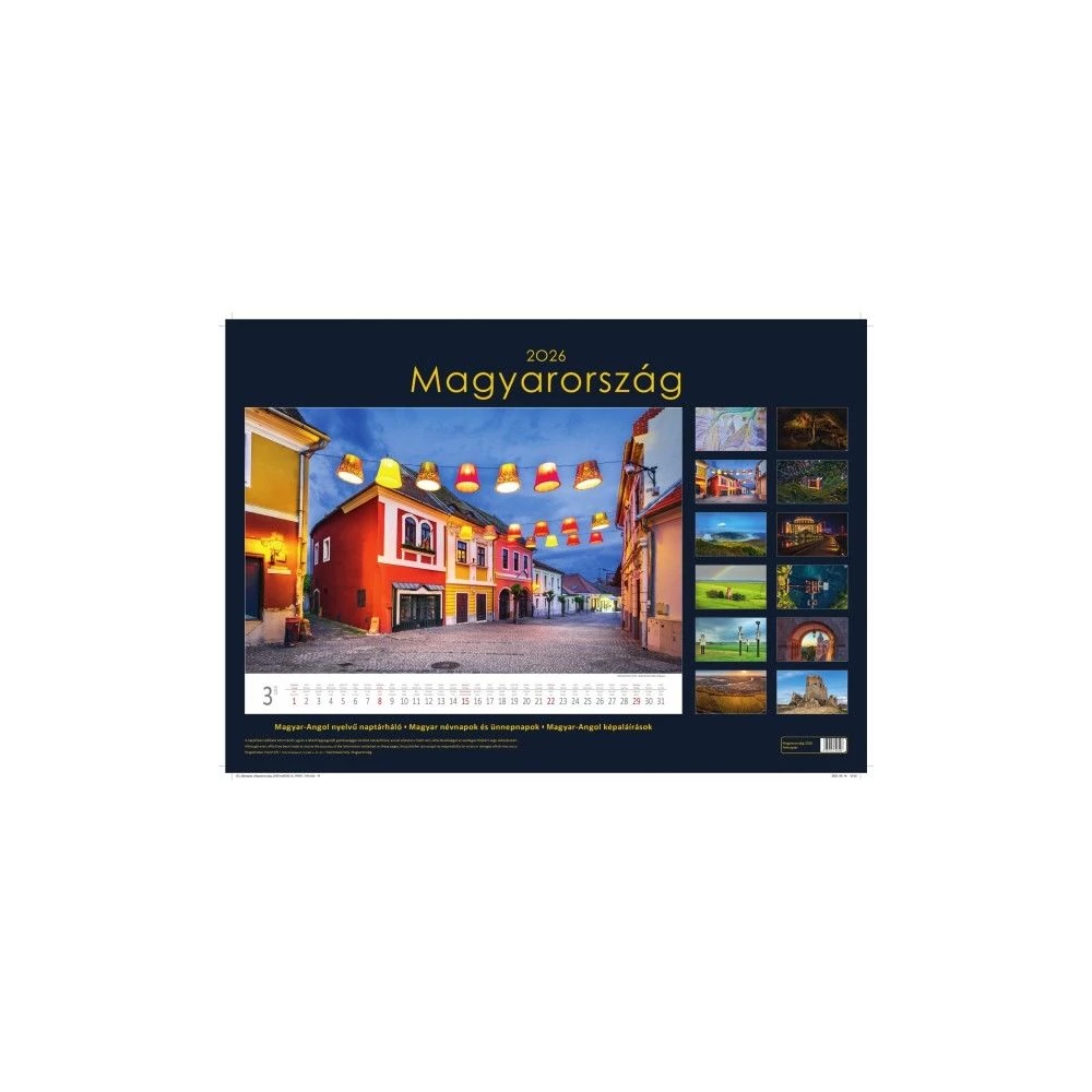 Válogatott, gyönyörű képekkel, kiváló minőségű papírral, erős hátkartonnal és fém ikerspirállal készült falinaptárak.14 lapos, fekvő formátumú, magyar és angol nyelvű naptárrésszel, magyar ünnepeket és névnapokat tartalmaz. Mérete: 48,5 x 34 cm. Reklámfelület: 48,5 x 5 cm. A falinaptárak piskóta füles, átlátszó tasakban kerülnek szállításra. Reklámfelület: 48,5*5cm.