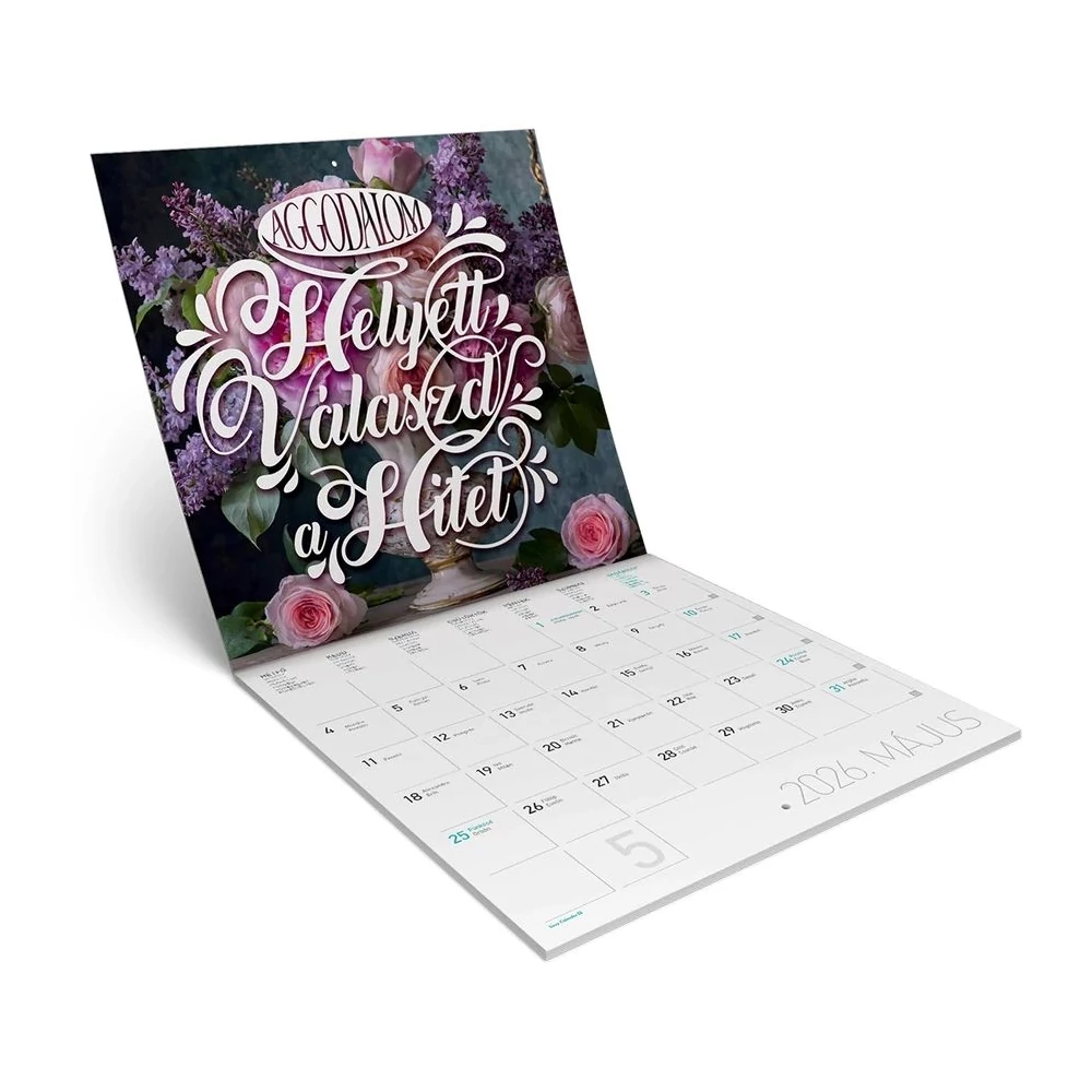 30x30 cm méretű, képes falinaptár (lemez), 12 hónap, ünnepekkel, névnapokkal, irkatűzött, 28 oldal, lyuk az akasztáshoz, 300x300 mm