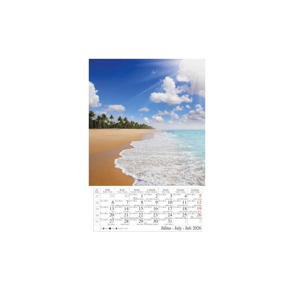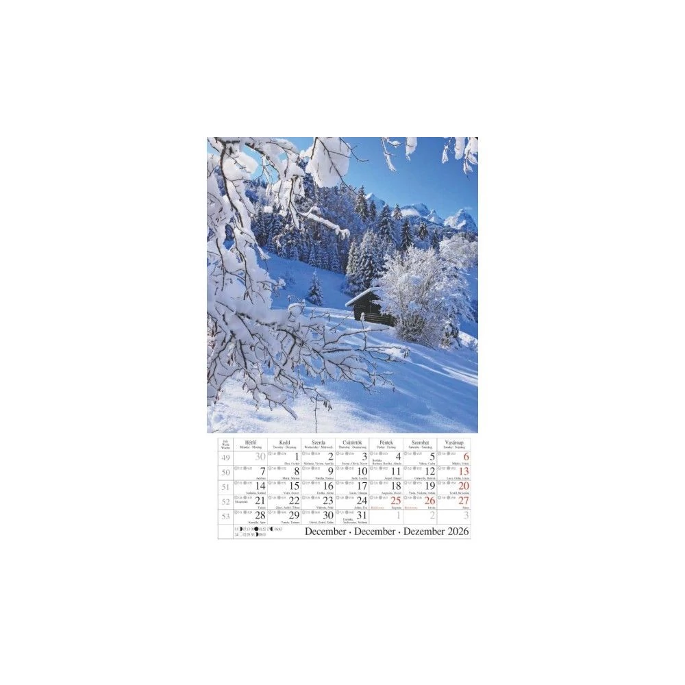 - 6 lapos, átfordítós álló formátumú, magyar, német és angol nyelvű spirálozott falinaptár, napkelte, napnyugta és holdállás feltüntetésével. Magyar ünnepeket és névnapokat tartalmaz. Mérete: 21x32 cm