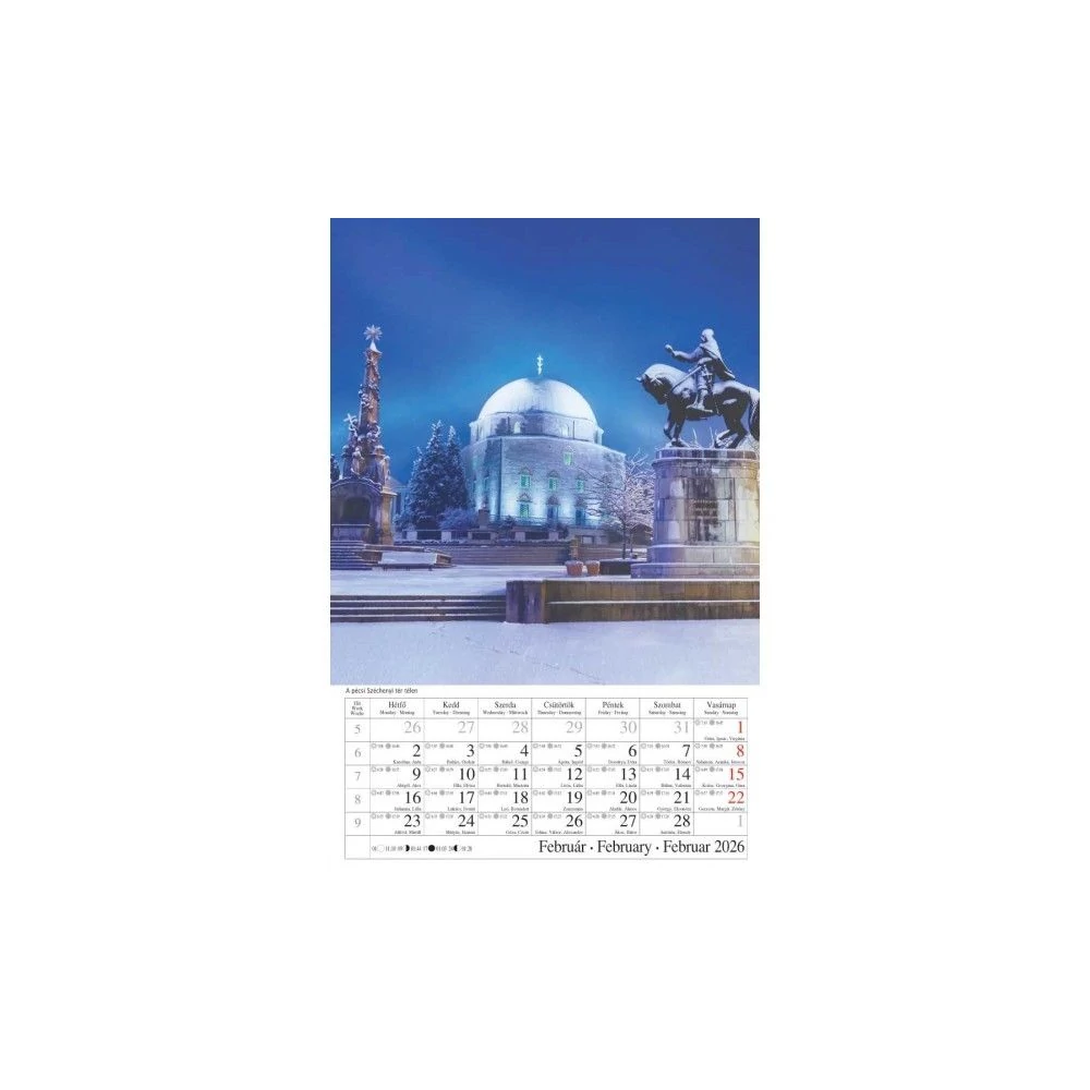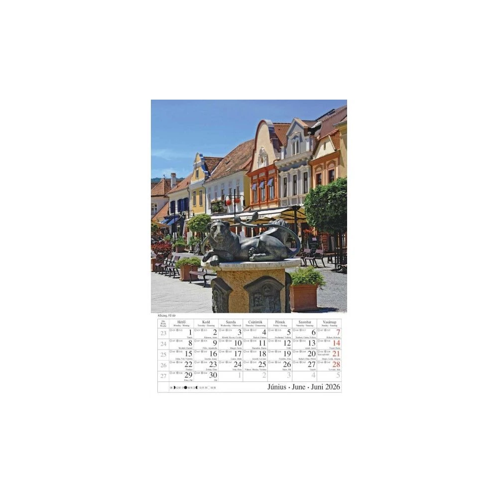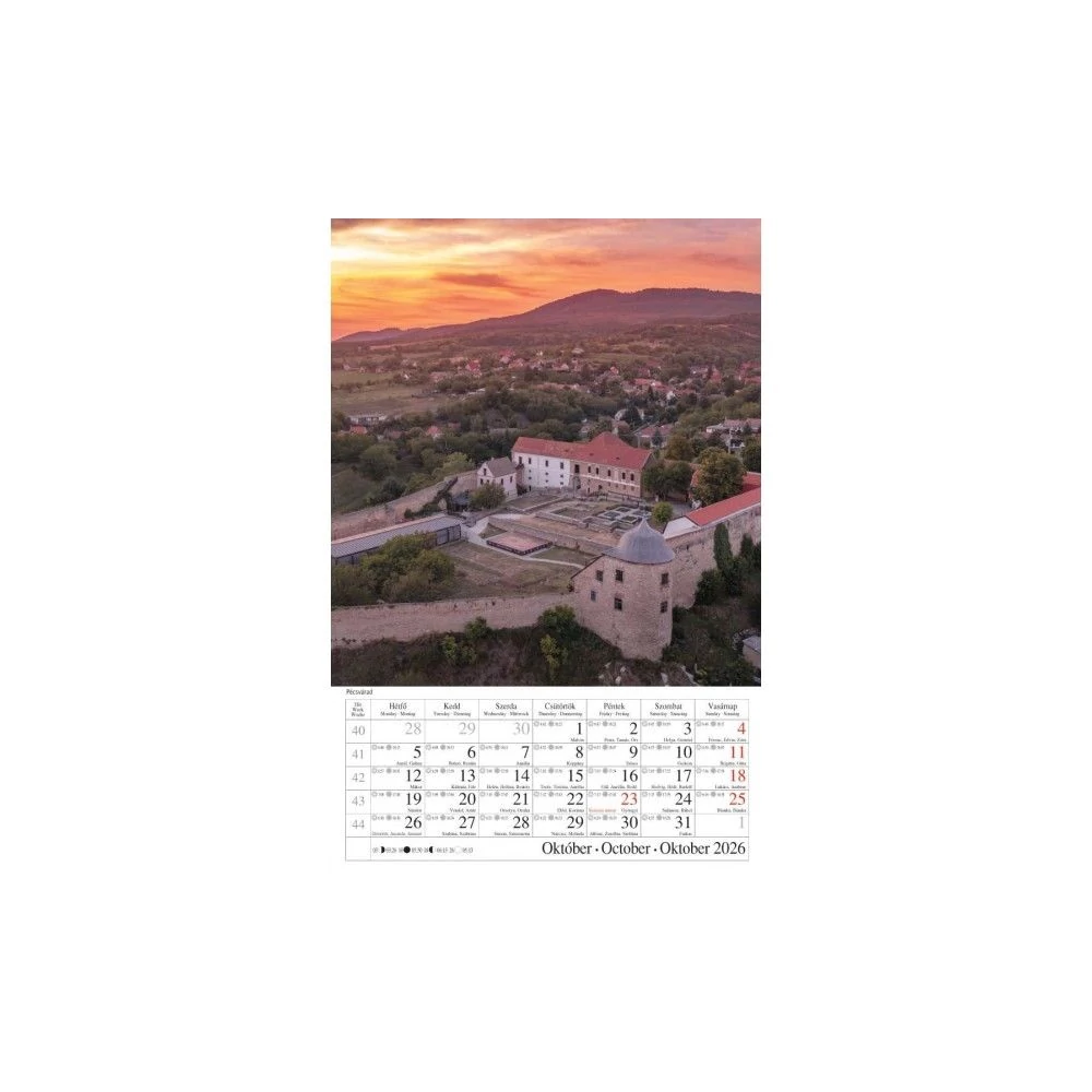 - 6 lapos, átfordítós álló formátumú, magyar, német és angol nyelvű spirálozott falinaptár, napkelte, napnyugta és holdállás feltüntetésével. Magyar ünnepeket és névnapokat tartalmaz. Mérete: 21x32 cm