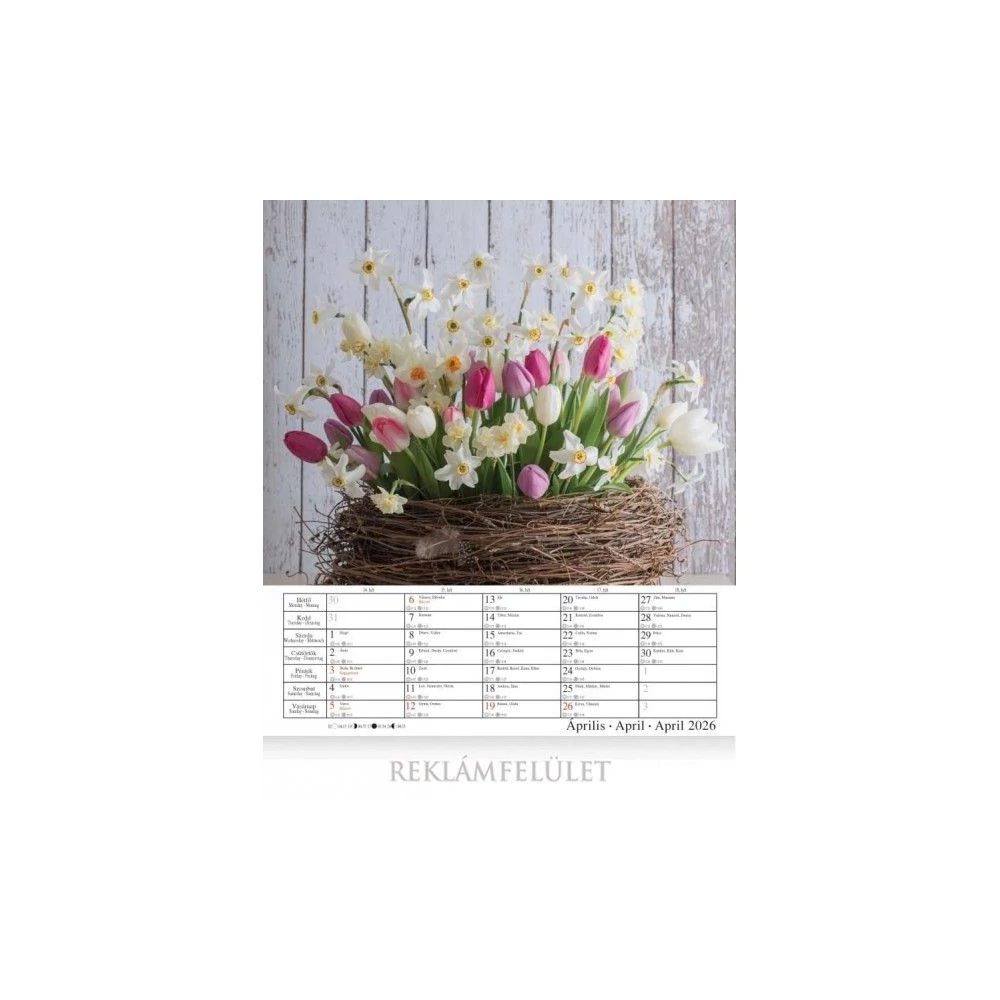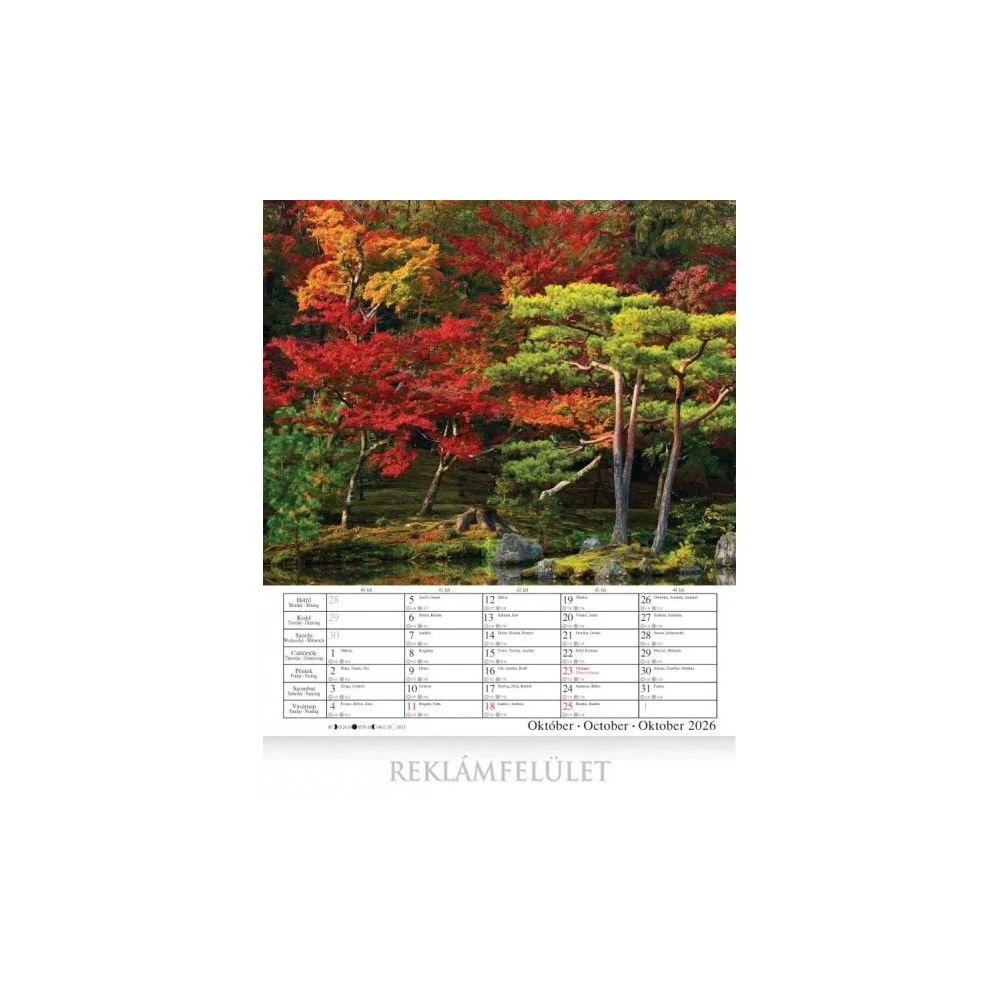 14 lapos , álló formátumú, magyar, német és angol nyelvű spirálozott falinaptár, napkelte, napnyugta és holdállás feltüntetésével. Magyar ünnepeket és névnapokat tartalmaz. Mérete: 30 x 34 cm. Reklámfelület: 30 x 4cm.