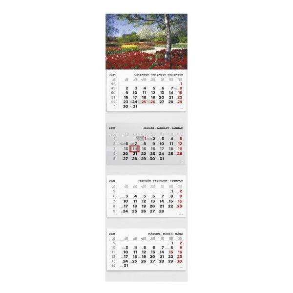 4 tömbből álló 3 havi speditőrnaptár. Kiterített mérete: 315 x 1065 mm,