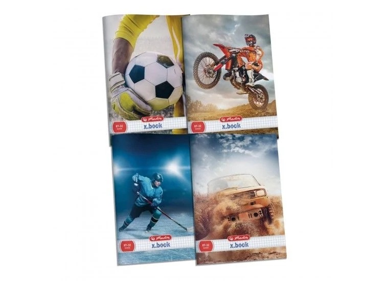 A4-es méretű, 32 lapos, 87-32-es kockás iskolai füzet Sport, mintás fedlappal, hófehér belívvel. Az x.book termékcsalád része, 4 mintával.