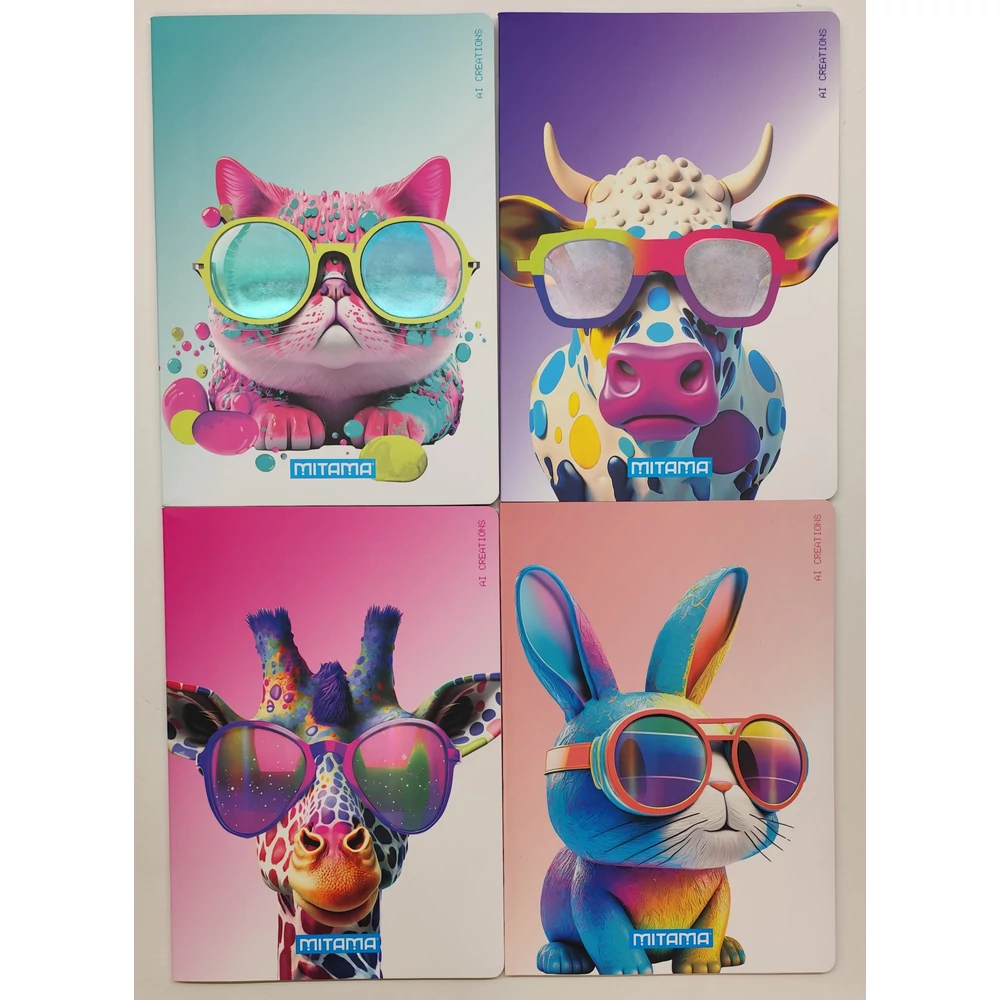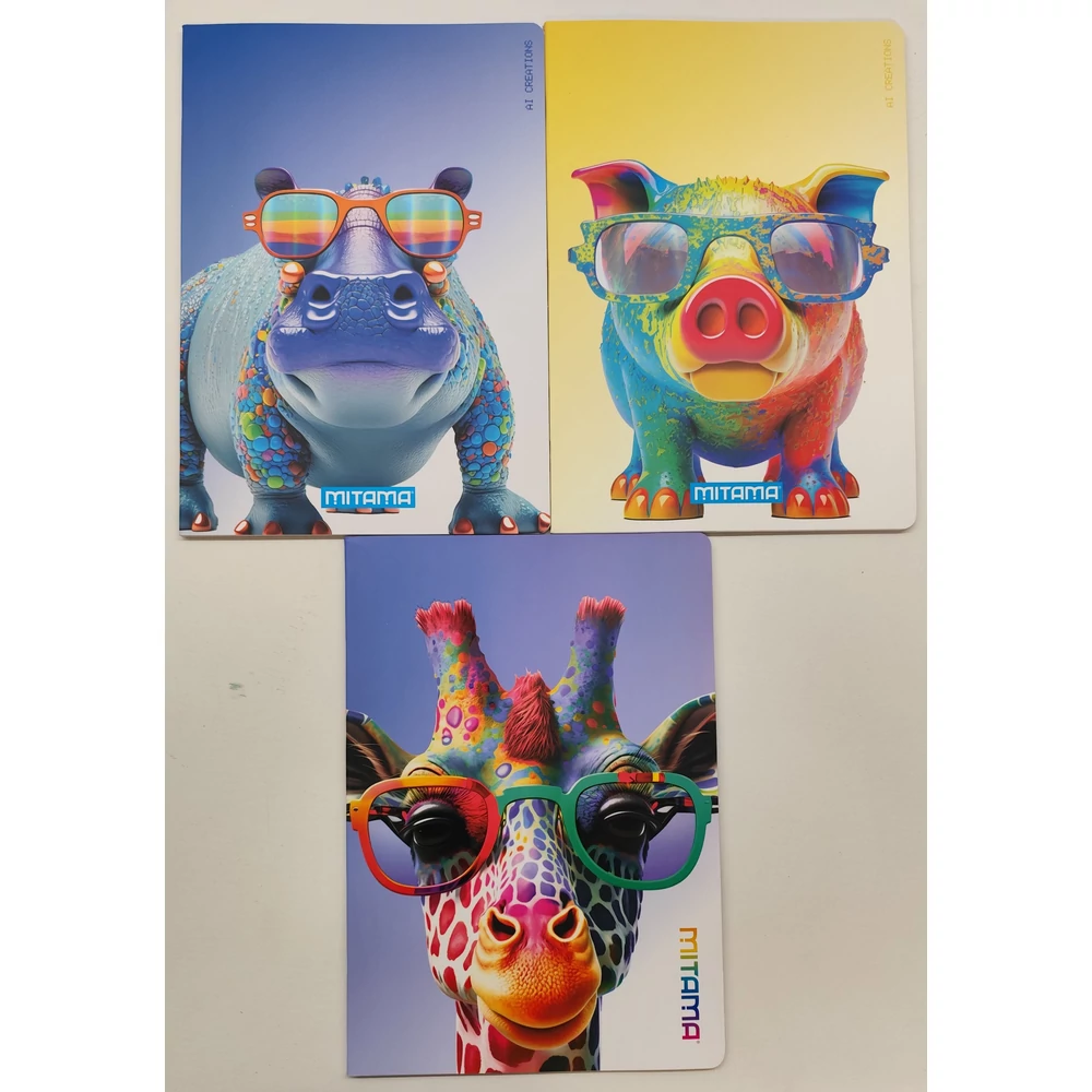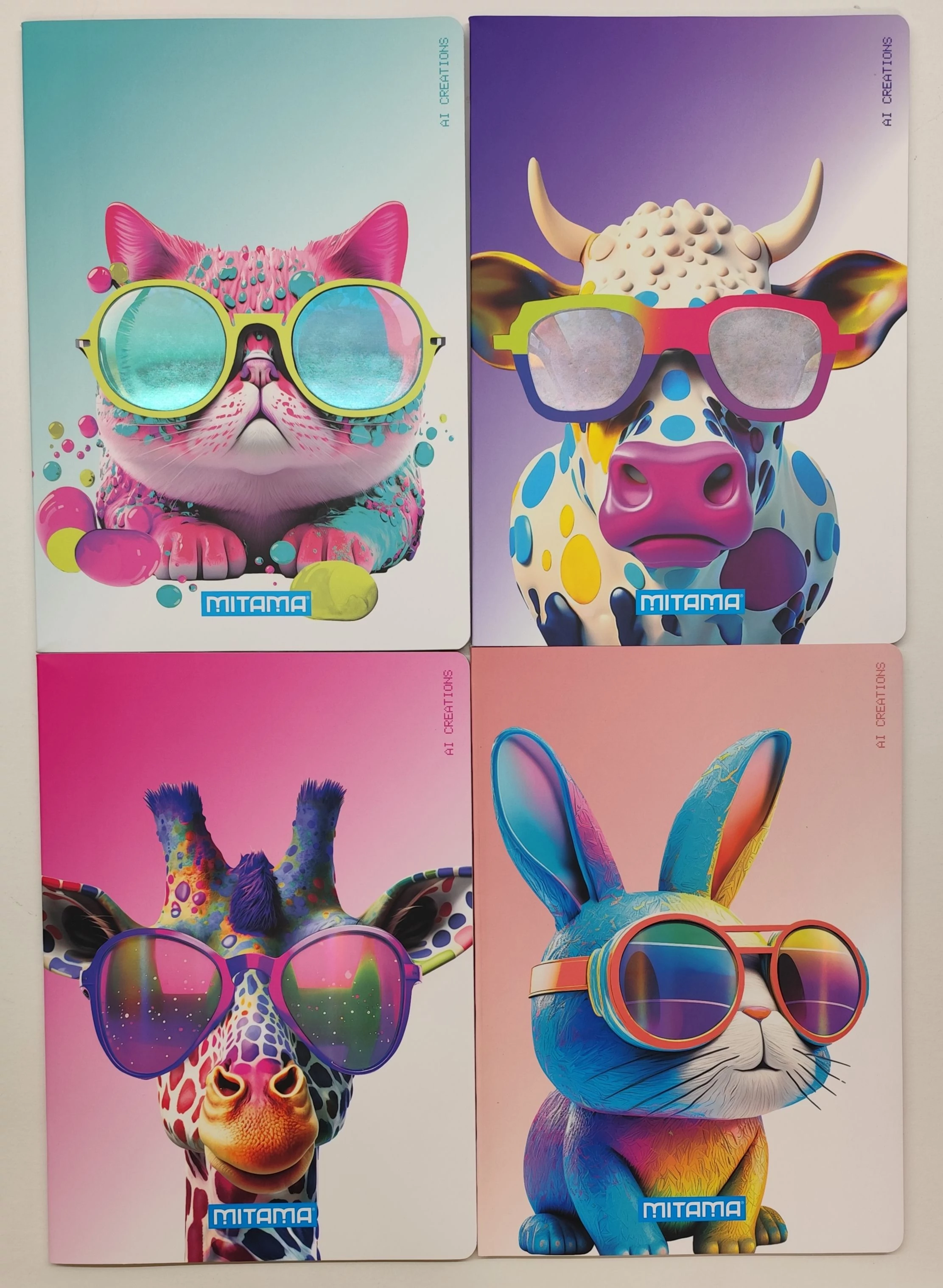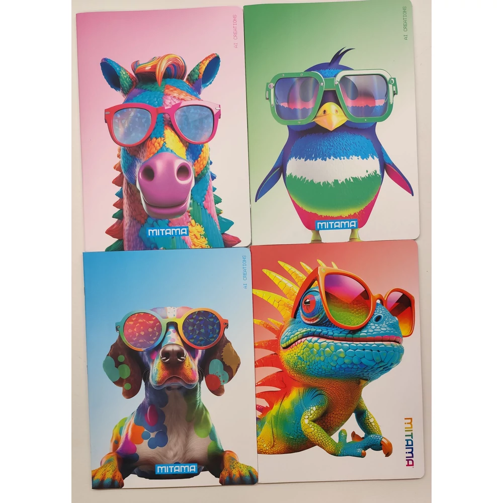 Élénk és játékos design: A füzetek borítói színes mintákkal és divatos napszemüvegekkel díszített állatokat ábrázolnak.
