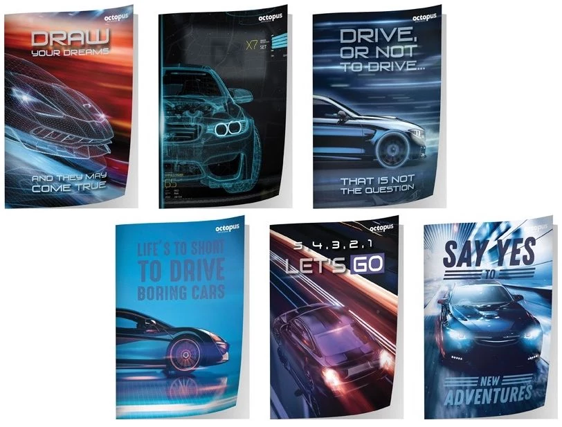 52 lapos kiváló minőségű füzet. 80 g-os hófehér belív, 300 g-os borítóval. 6 minta / kollekció.