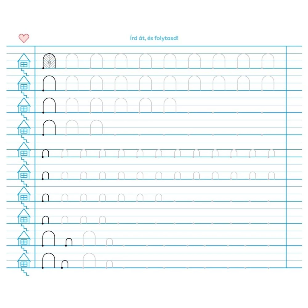 A házikó megkönnyíti a vonalközben való tájékozódást, a szívecske a balról jobbra haladást. A nagyobb – 7 mm-es – vonalközök elég helyet hagynak az első betűk megformálásához. A füzet előre írt írásmintákkal segíti a helyes betűformák és kötések begyakorlását a betűelemektől a betűkön keresztül. A füzet méretét a kisgyermekek testarányaihoz igazítottuk, amely 32 lapos, fekvő formátumú speciális méretű: 235*280 mm. A sarkok kerekítettek és a füzet matt fóliával van bevonva.