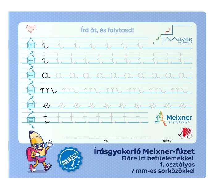 Írás gyakorló füzet előre írt betűelemkkel és betűkkel az 1. osztályosok számára, amely a Meixner Alapítvány együttműködésével és ajánlásával jött létre. Speciális vonalazású és kialakítású füzet alkalmas a Meixner-féle írás tanulás elsajátítására és gyakorlására.