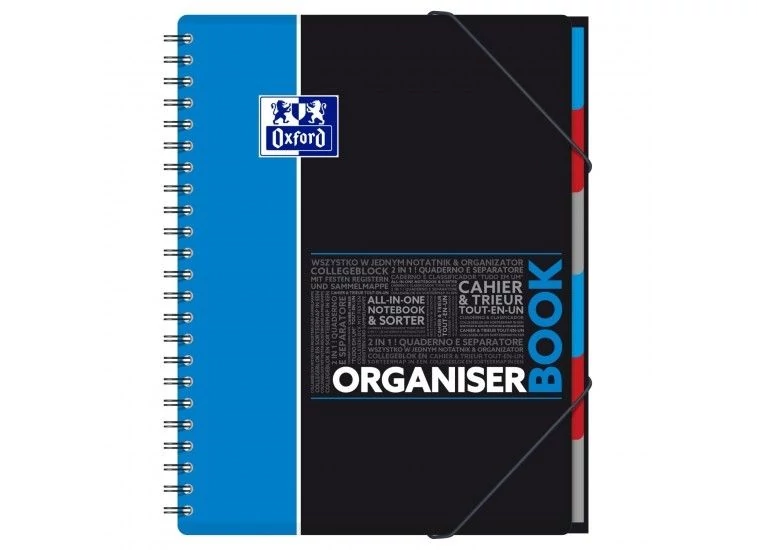 Oxford International Organiserbook A4-es méretű, 80 lapos, vonalas, ikerspirálos jegyzetfüzet, 4 különböző színben, hófehér belívvel, fejléccel és margóval. Erős, szakadás- és vízálló PP fedlappal. Rugalmas gumiszalaggal záródik, a 6 kivehető regiszterrel a füzet praktikusan tagolható, a füzet végén pedig egy 3 pólyás iratmappa található, amelynek hosszanti pólyája könyvjelzőként is szolgál. A könyv elején található indexoldal a tartalom gyors és hatékony áttekintésére szolgál. Előre perforált és lyukasztott lapokat tartalmaz. Kompatibilis az ingyenes SCRIBZEE okostelefon-alkalmazással a jegyzetek beolvasásához, rendszerezéséhez és a dokumentumok kikereséséhez. A belívek 90 g/m2 vastagságú Optik Paper-ből készülnek, amin a tinta nem üt át, így a lapok mindkét oldalára írhat anélkül, hogy aggódnia kellene a hátoldalon lévő jegyzetek miatt. A kiváló minőségű papírnak és a gondos gyártásnak köszönhetően a füzetek nemcsak szemet gyönyörködtetőek, hanem igazi élvezetet nyújtanak írás közben.