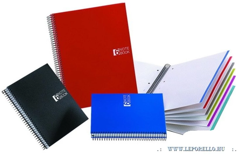 -Színes PP borító. Mikroperforált és lyukasztott lapok. Hat színregiszter. 70 g-os ofszet nyomású beloldalak. Visszaforduló spirálozási technika.