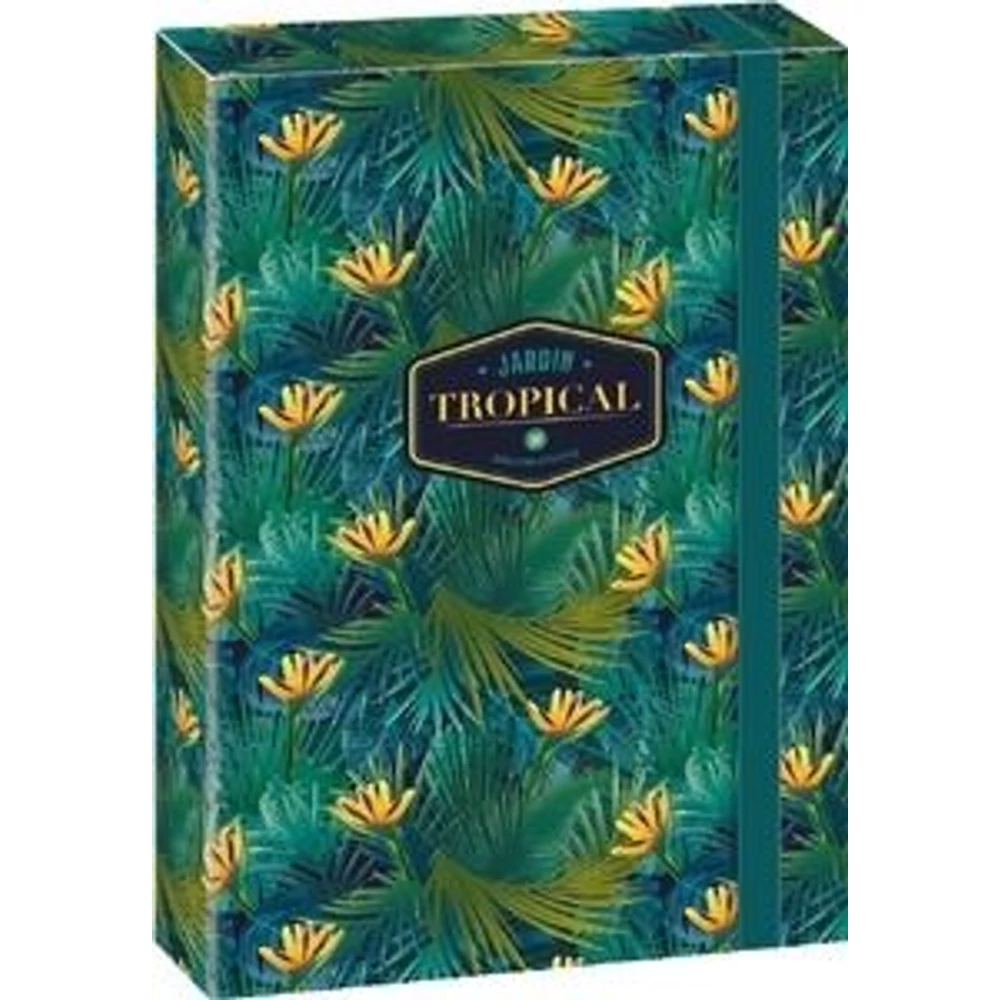 Minták: D03151ATF921-Tropical Florida , D03151ATL922-Tropical Leaf, D03151ATW920-Tropical Wildblume, - A/4-es méretű füzetbox, vastag, tartós karton alapanyag, 7 mm széles gumiszalag. Belseje mintával nyomott. - Füzetek, iratok tárolására vagy táska helyett is alkalmas. , Méret:230x335x45 mm Többféle mintával.