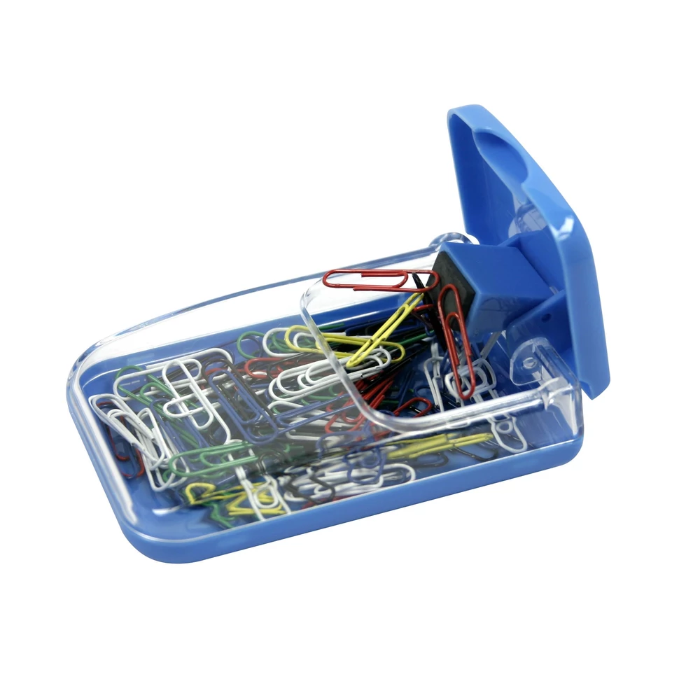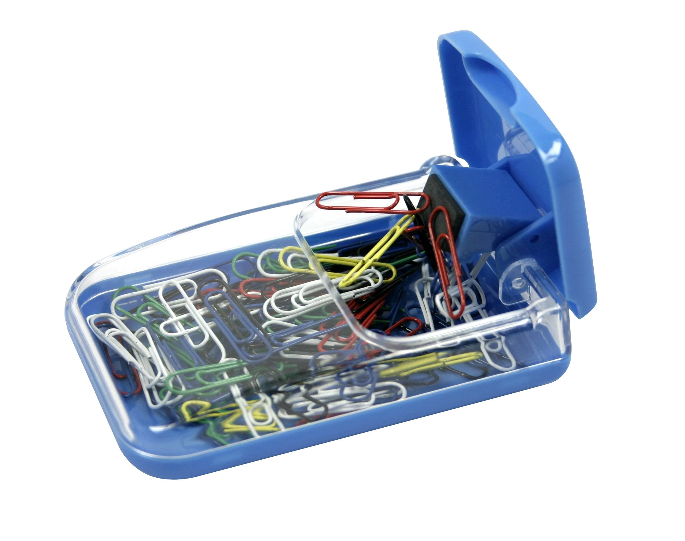 Színek: fekete, fehér, kék Átlátszó műanyag testű gemkapocstartó, mágneses fedéllel.