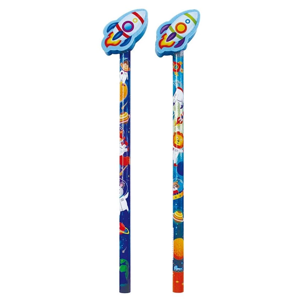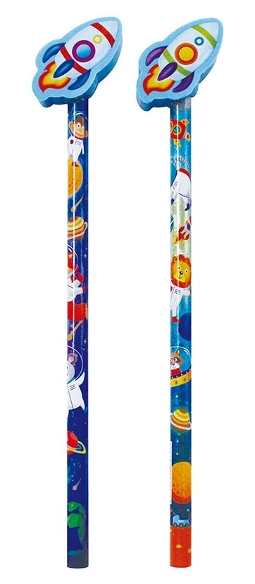 Állatos motívummal díszített grafitceruza, űrhajó formájú radírral. Keménység: HB.