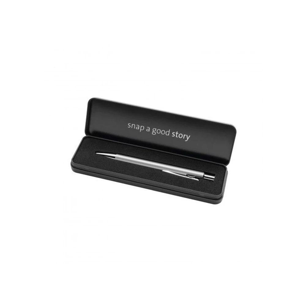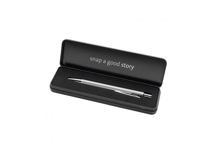 Ajándékdobozos Snap fém golyóstoll, nyomómechanikával, minimalista dizájnnal, gyöngyházfestéssel, kék írásszínnel. Az alumínium tolltesthez képest nehezebb sárgaréz hegy biztosítja a súlypont elmozdulását a hegy felé, ami ergonomikusan optimalizált írást tesz lehetővé. Nagytartályos golyóstollbetéttel utántölthető