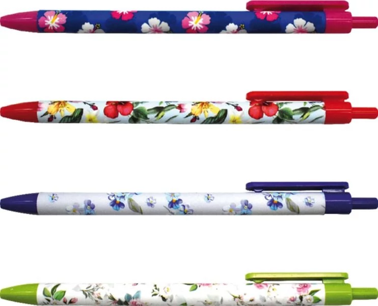 - Mintás műanyag tolltest. - Színes, műanyag klip. - Nyomógombos kivitel. 0,5 mm golyóátmérő. - Kék tinta.
