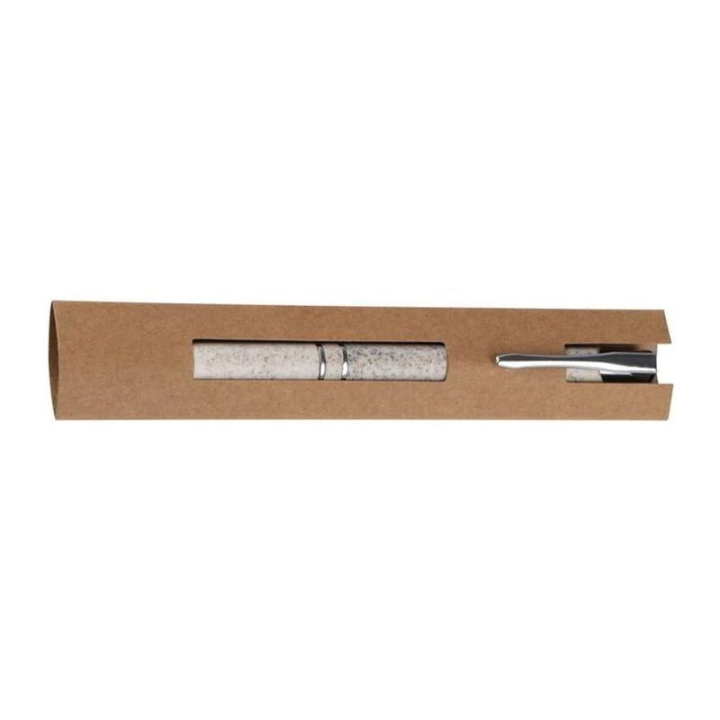 Natúr színű golyóstoll, búzaszalma bevonattal, ezüst kiegészítőkkel és kéken író nagyméretű tollbetéttel.