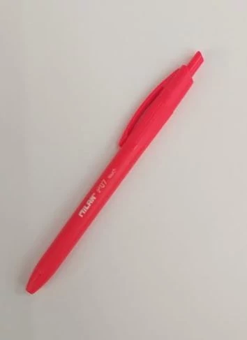 színek : F0117507200-fekete, F0117507400-piros, F0117507100-kék - Különleges, gumírozott hatású tolltest. Nyomógombos tollszerkezet. 0,7 mm-es vonalvastagság. A tolltest színével megegyező írásszín.
