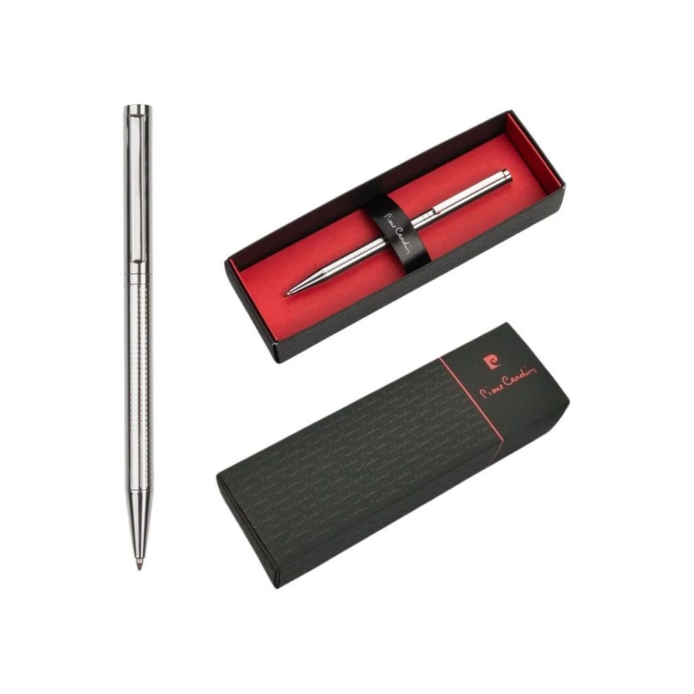 Pierre Cardin luxus fém golyóstoll, nagyon egyedi dizájnnal. Az ezüst tolltestet mély gravír és fekete kiegészítő részek díszítik. Kék tollbetéttel, Pierre Cardin díszdobozban, hitelességi bizonyítvánnyal szállítjuk.