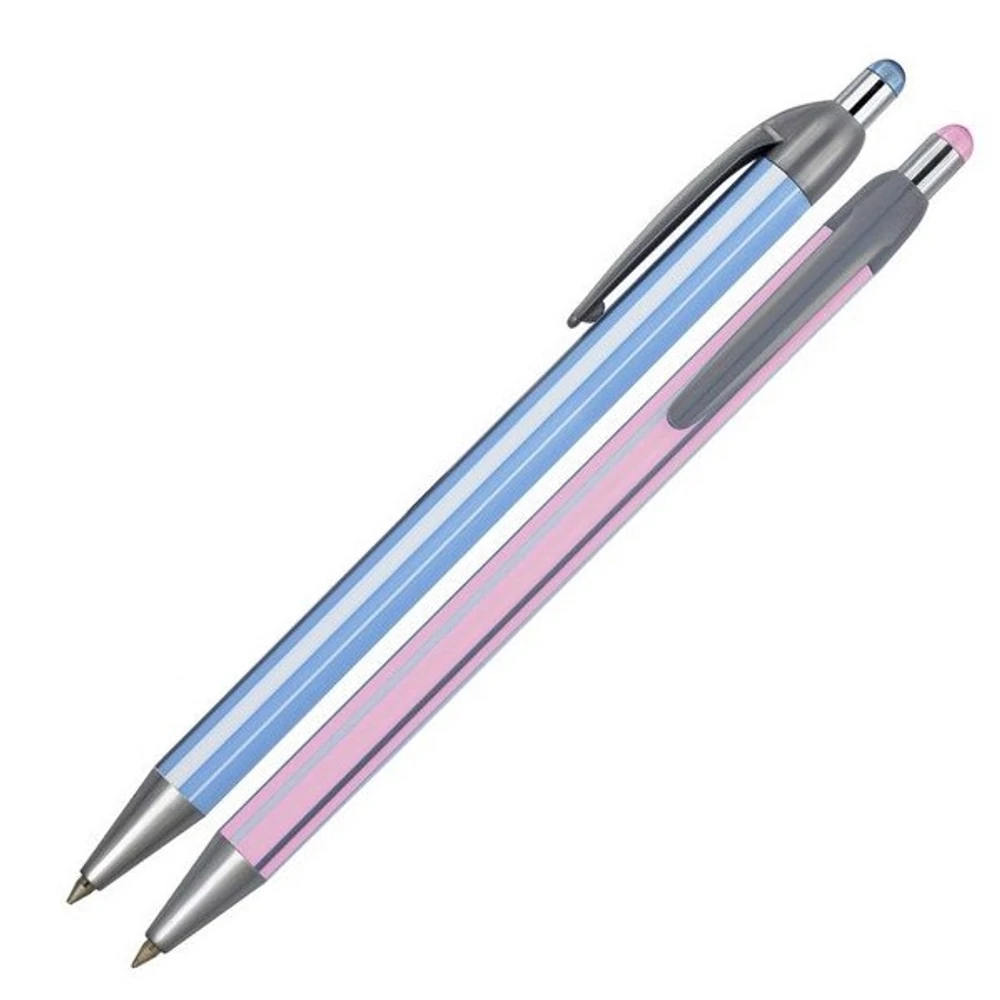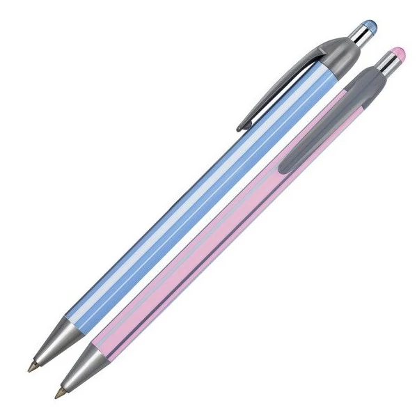 - Könnyű, vékony tolltestű, kék és rózsaszín alapon csíkos mintázatú golyóstoll