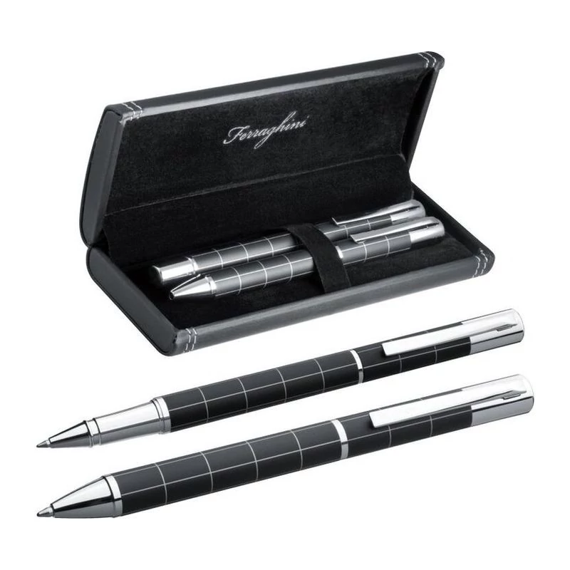 Az írás művészet - luxus fém toll szett egyedi tervezésű kéken író golyóstollal és egy feketén fogó rollertollal. A termék megjelenése az igényes kidolgozású fekete tolltartóval válik teljessé.