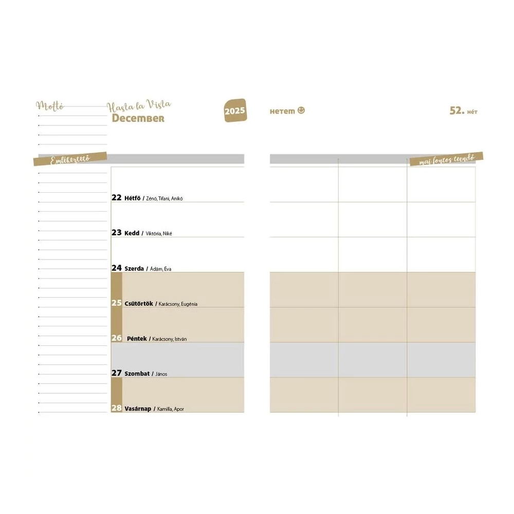 Egyetemisták, főiskolások, felsőoktatási továbbképzésen résztvevők számára. 108 oldal heti beosztású naptár (2025. augusztus 18-tól 2026. augusztus 23-ig), 30 oldal információs blokk, órarend, vizsgatervező, félévi tanulmány oldalak, 14 oldal olvasmányok, tippek, 8 oldal vonalas és kockás jegyzetoldalak