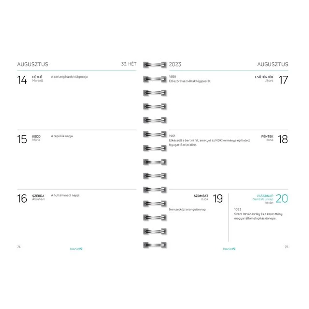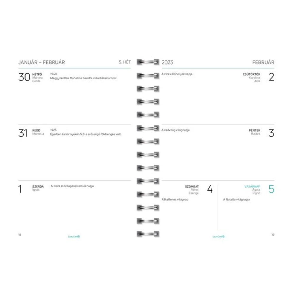 Minták: 21930599-Eight, 21930699-Five, 21930799-Four, 21930899-Nine, 21930999-One, 21931099-Seven, 21931199-Six, 21931299-Three, 21931399-Two Méretek : 12*16.6cm, 128 oldal. Boritó: 250gr. matt fólia, UV lakk. Belív: 80gr fehér ofszett, 2+2 szín, spirálozott, gumipántos. heti tervező, éves bontás, névnapok, állandó és változó dátumú magyar és nemzetközi ünnepek, eseménynaptár, (minden napra egy érdekes történelmi esemény), jegyzetek
