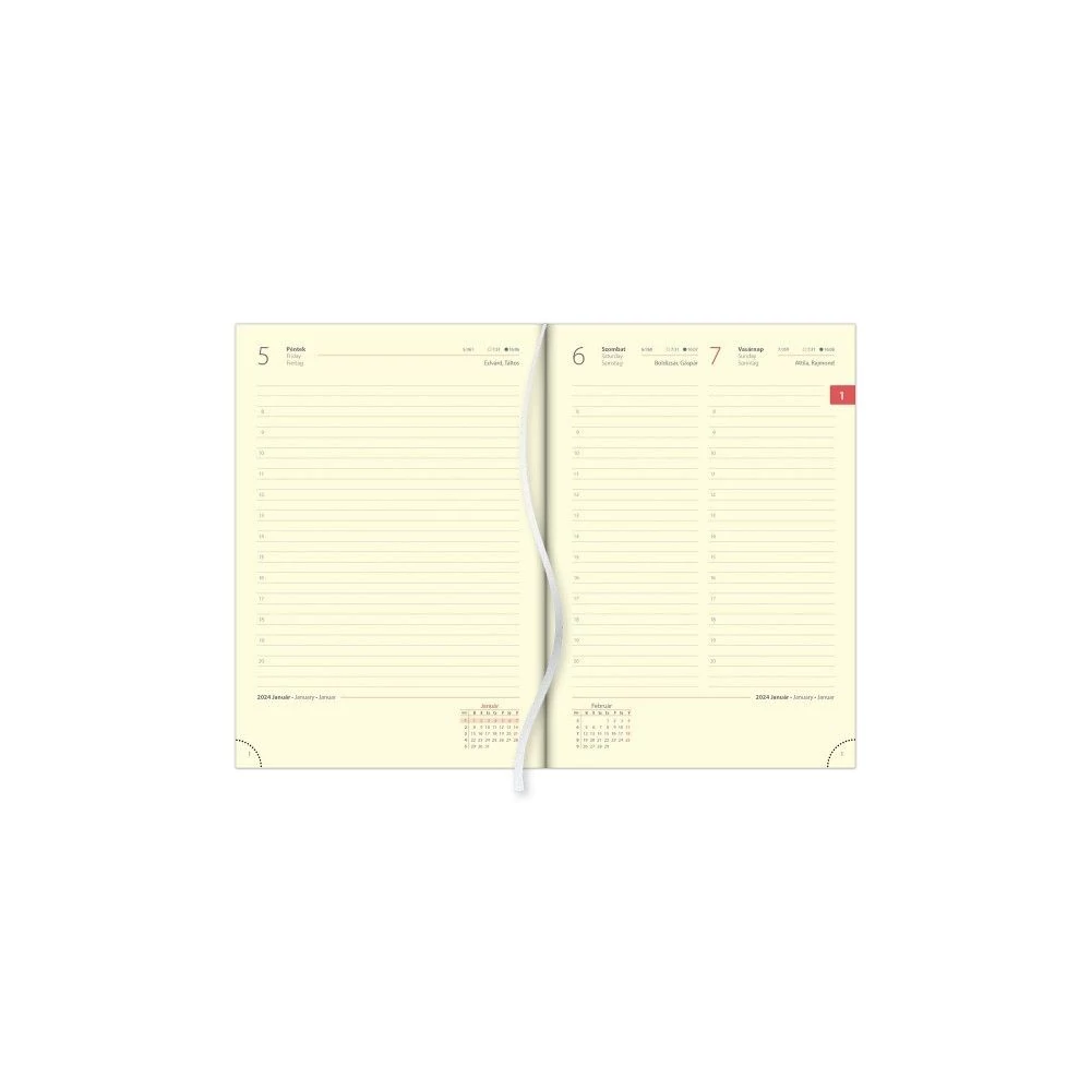 - A5 napi naptár, 1 nap / 1 oldal beosztással (szombat és vasárnap egy oldalon). Az A5 napi határidőnapló felépítése: Személyes információk Összesített naptár Éves tervező horizontális Éves tervező vertikális Térképek Névnapok listája Nemzetközi ünnepek 1 nap / 1 oldal beosztású naptár (névnapok, magyar ünnepnap kiemelés, napkelte és napnyugta adatok, holdállás, eltelt/hátralévő napok, napi teendők, összesített havi naptár, jegyzetrész) Jegyzet oldalak, melyek telefonregiszterként is használhatóak.