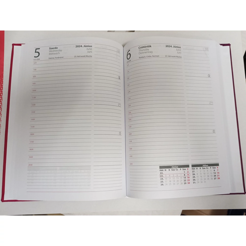 320 + 8 oldalas, A/5-ös méretű, hőre színeződő műbőr bevonóval készült szivacsbetétes előlap,  napi agenda könyvjelzővel. Lapméret: 145 x205 mm.