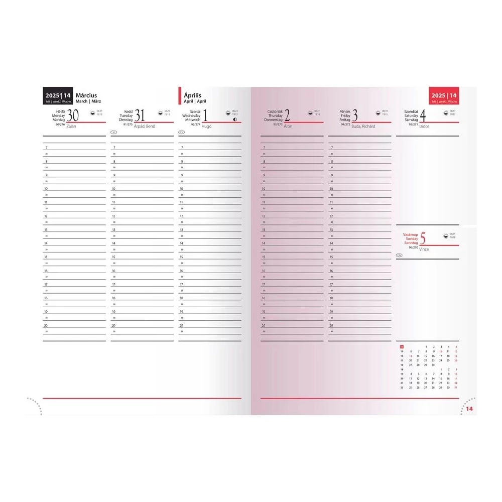 - 16 oldal információ, 4 oldal színes térkép, 144 oldal heti beosztású naptár, 13 hónapos, félórás beosztással, 16 oldal telefonregiszter.
