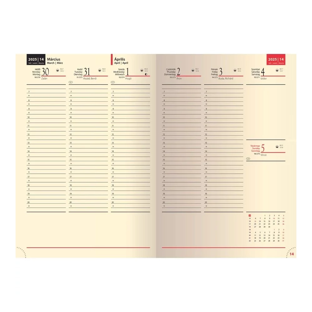 - 16 oldal információ, 4 oldal színes térkép, 144 oldal heti beosztású naptár, félórás beosztással,