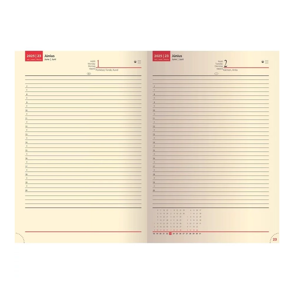 Hőre színeződő matt, varrott műbőr borítás. Napi beosztású, 400 oldalas. Extrák: jelzőszalag, sarokperforálás.