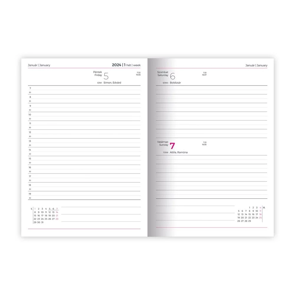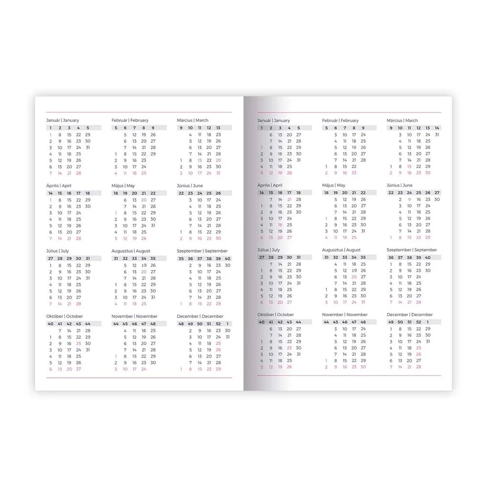 A5 méretű, szivacsos borítójú, napi bontású tervező, havi tervezővel, heti-havi összesítővel, 352 oldal, 148x210 mm