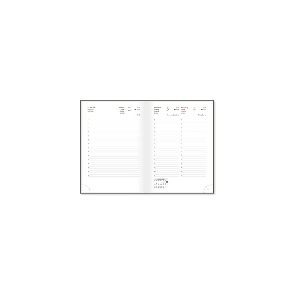 terjedelem: 352 oldal (16 információs oldal, 320 naptároldal, jegyzetek, telefonregiszter)