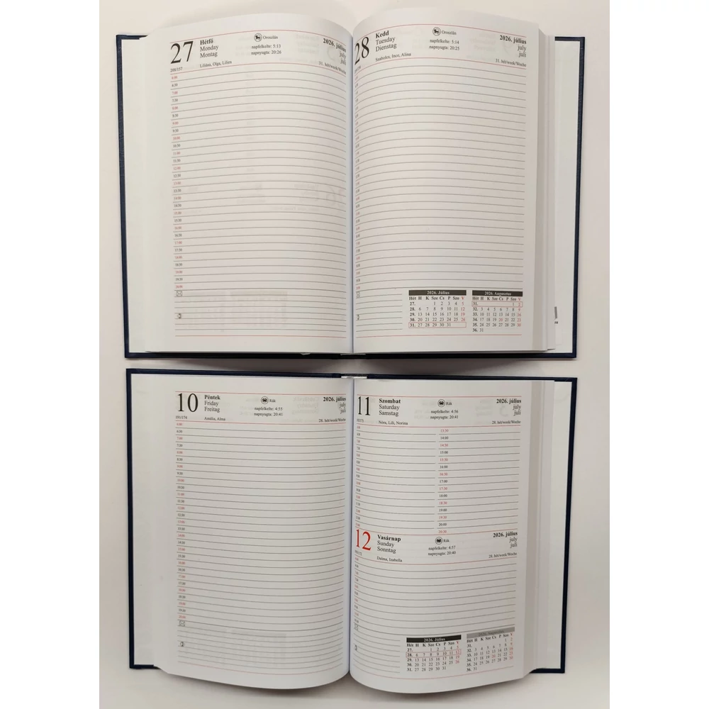 145x205 mm, 320 oldal terjedelem. 70 g-os belívek. 5 információs oldal, 315 naptár oldal. Naptárbeosztás hétköznap 6-20 óráig, szombaton 6-20:30 félórás, vasárnap 6-10:30 félórás. Jelzőszalag. Sarokperforáció. Szivacsos tábla, műbőr borítás.
