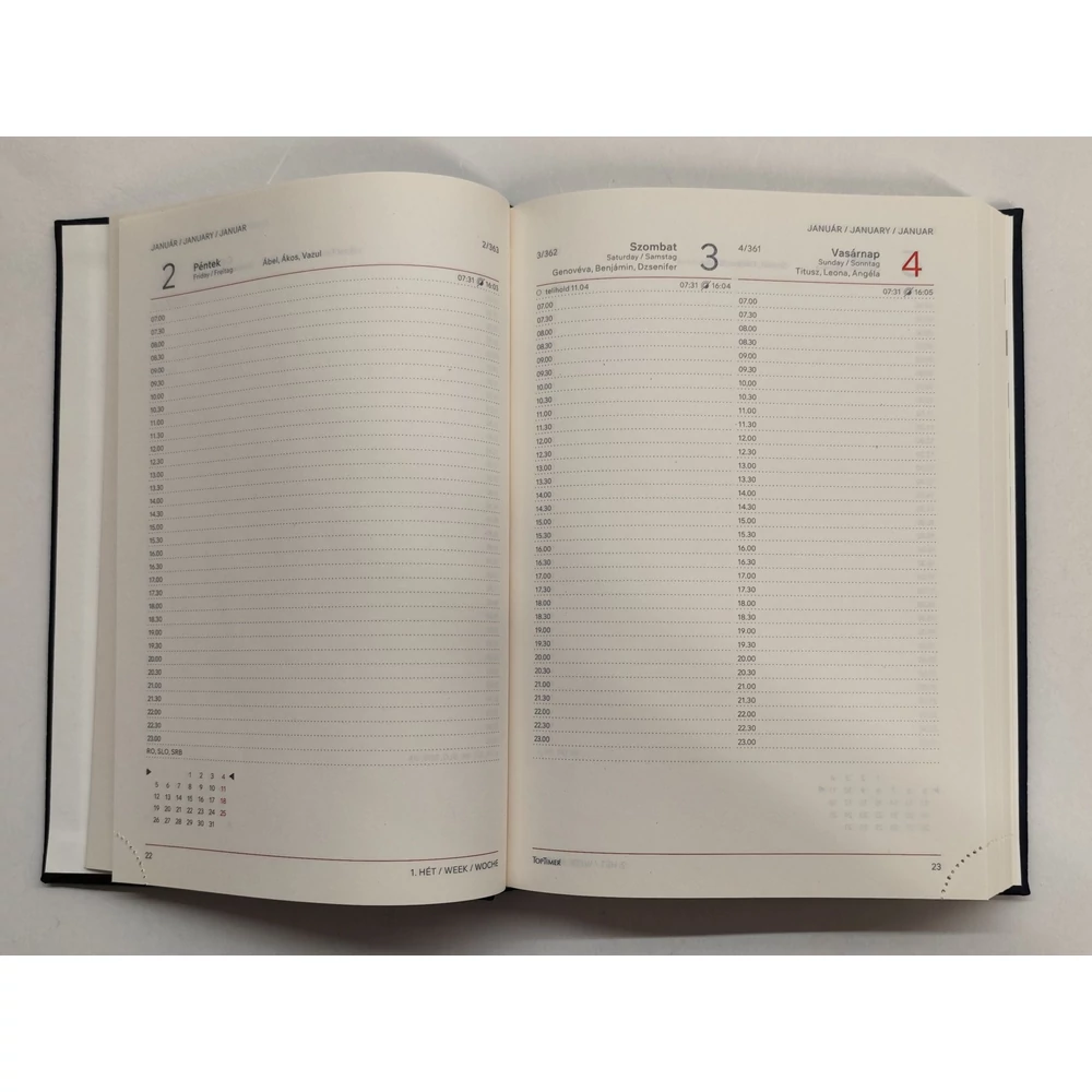 - félórás naptárbeosztású agenda jelzőszalaggal és sarokperforációval.