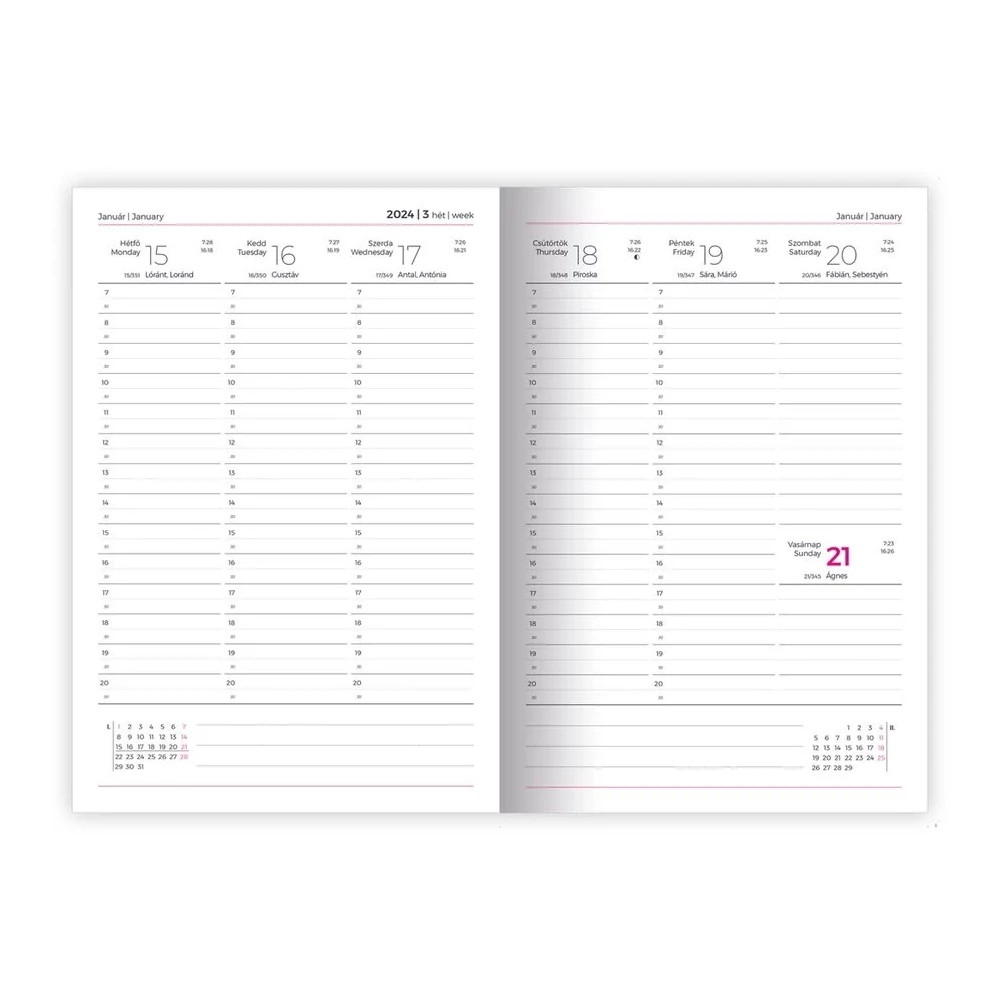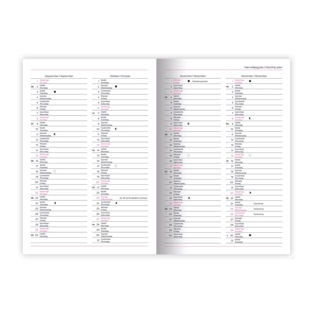 B5 méretű, szivacsos borítójú, heti bontású tervező, heti tervezővel, heti-havi összesítővel, 144 oldal, 165x240 mm