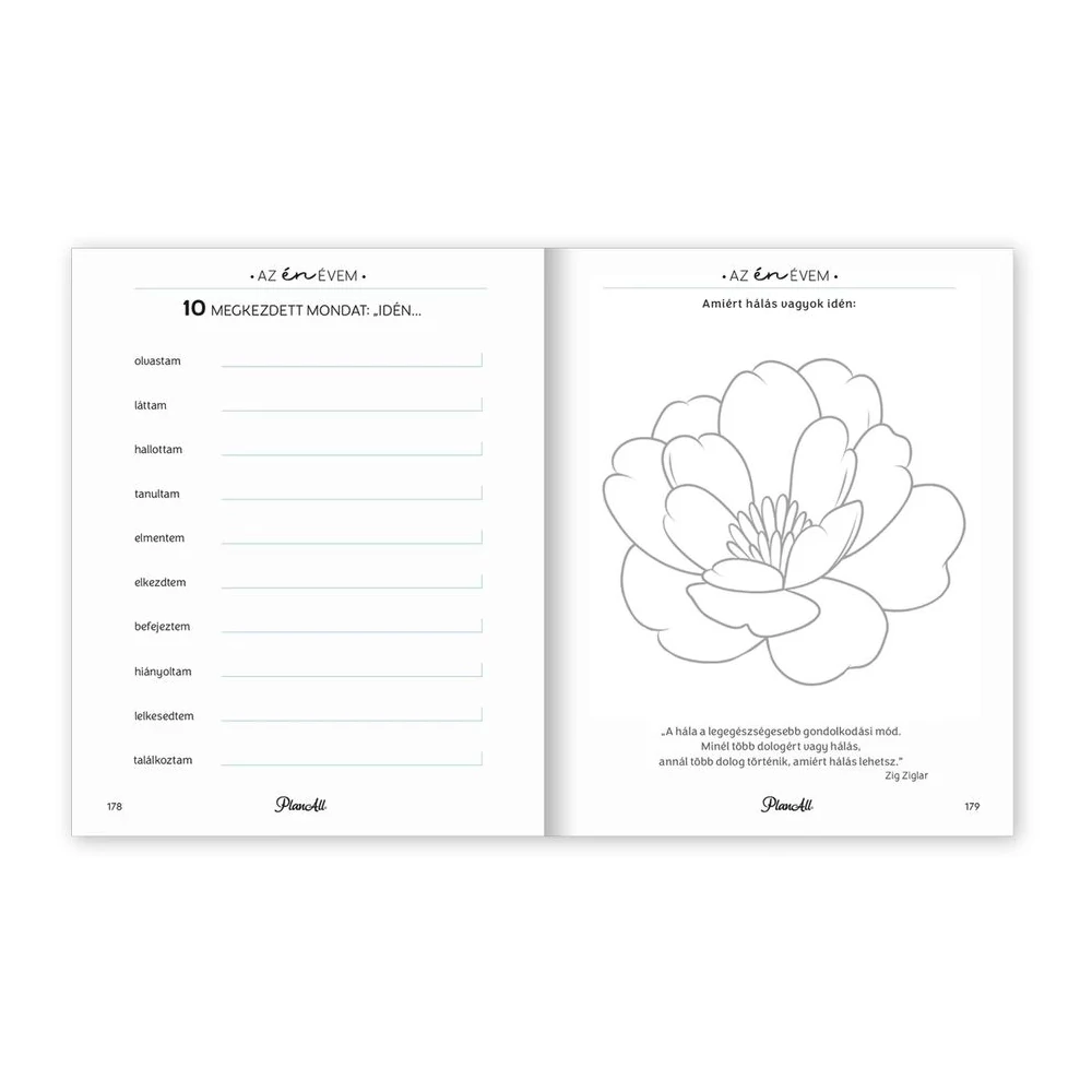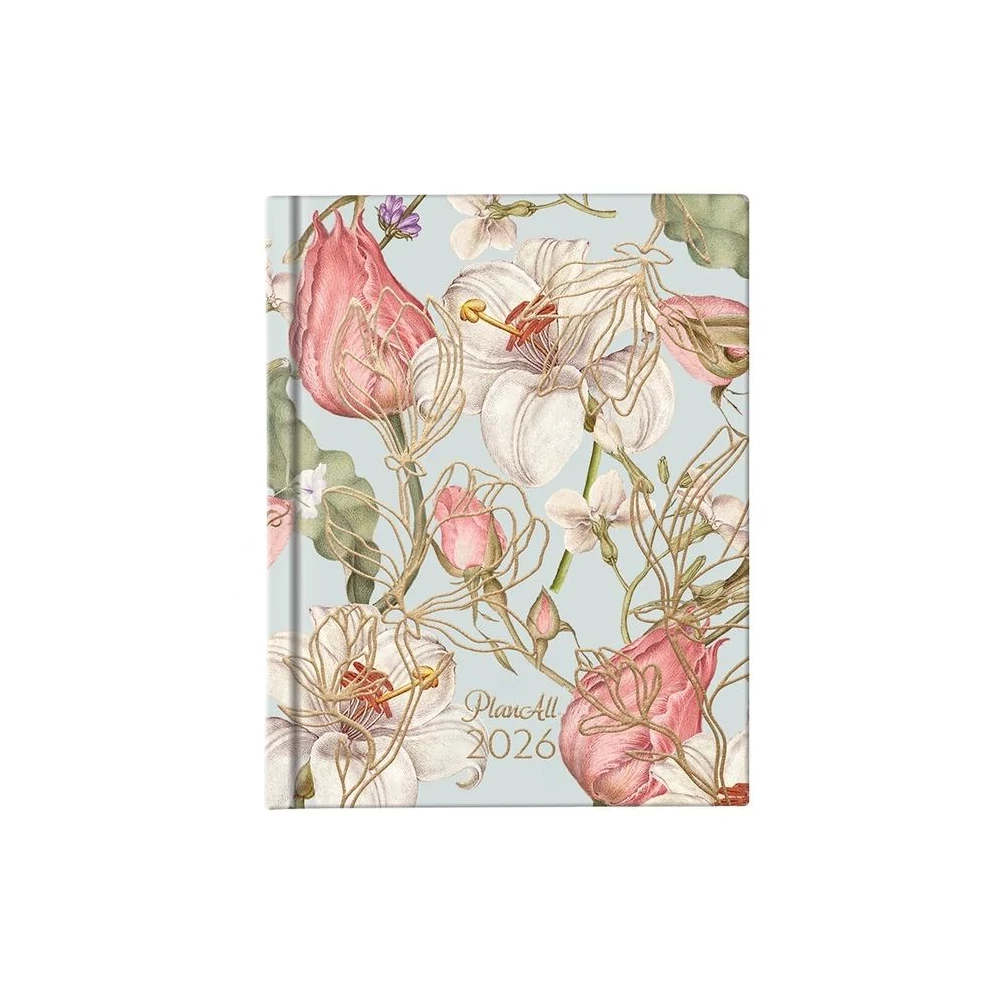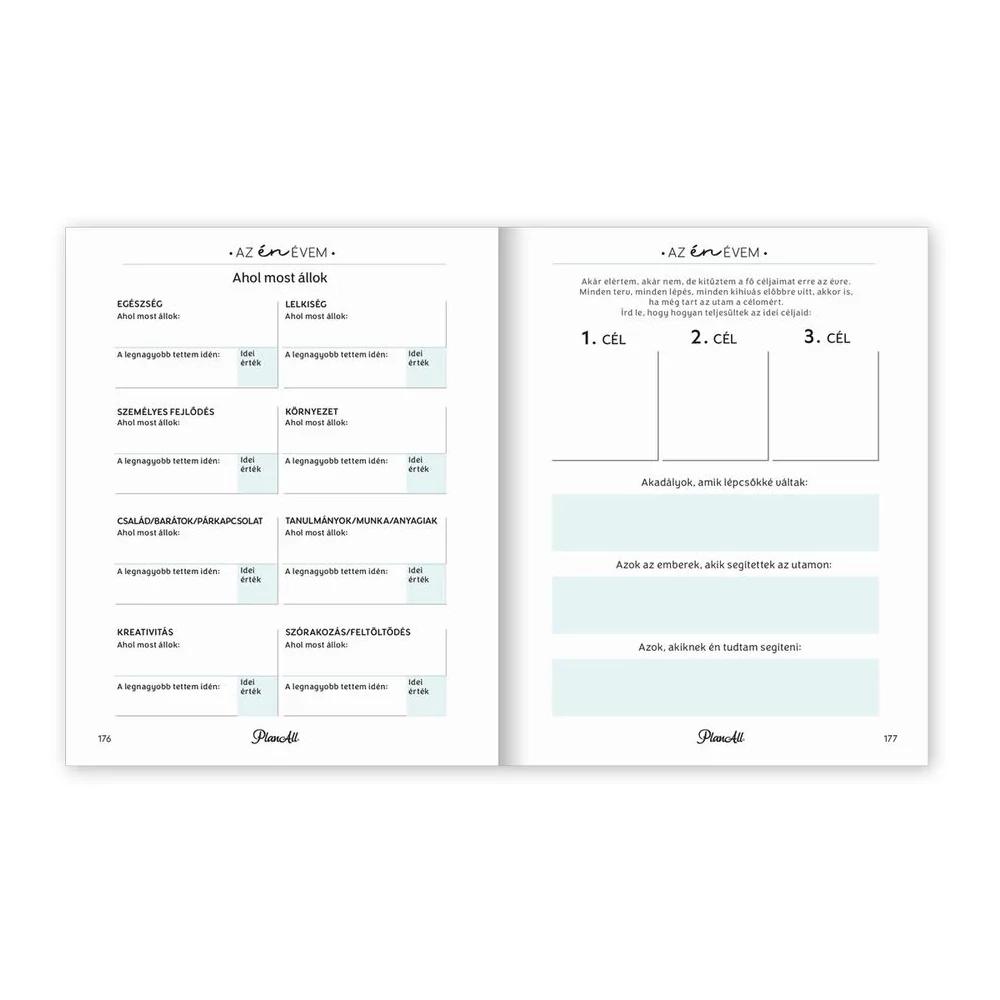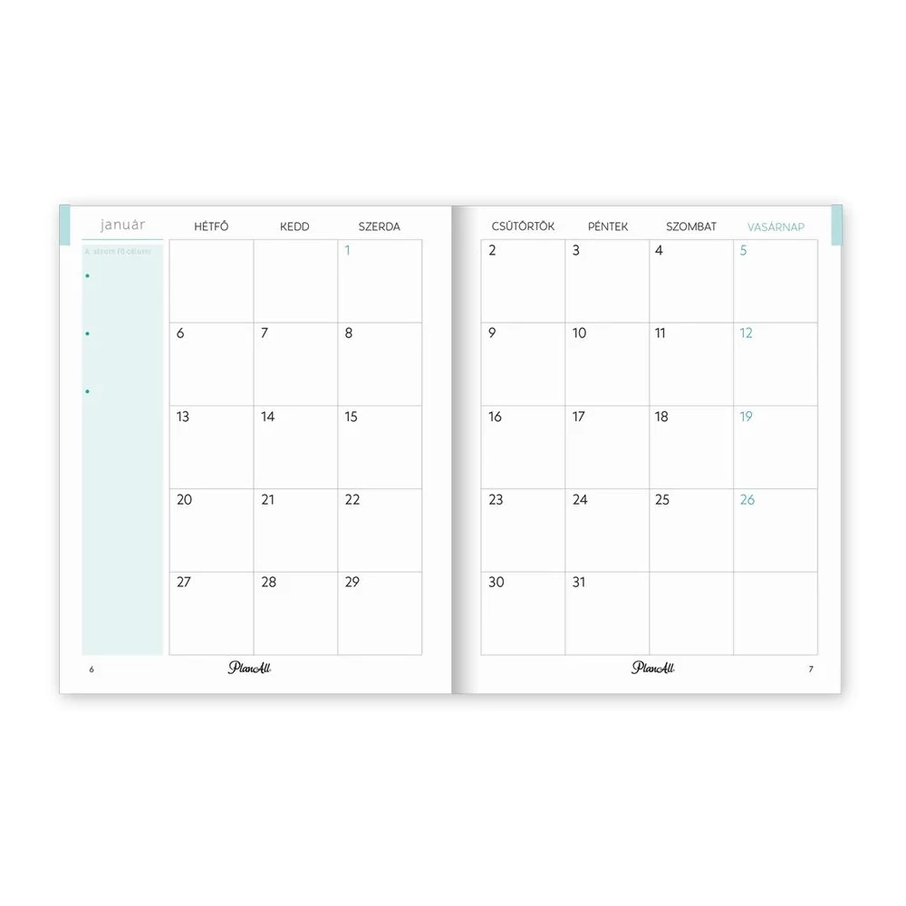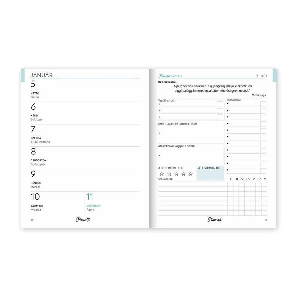 A6 méretű, keményfedeles, aranyozott, heti bontású zsebnaptár, Plann All System, heti tervező, motivációs idézetek, tennivaló lista, anyagi tudatosság. 192 oldal, irkafűzött, 107x134 mm.