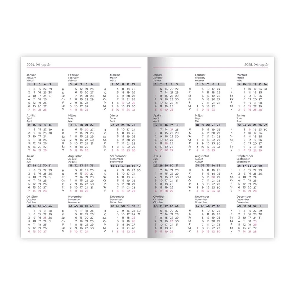 B6 méretű, keményfedeles, heti bontású tervező, heti-havi összesítővel, 144 oldal, 120x170 mm