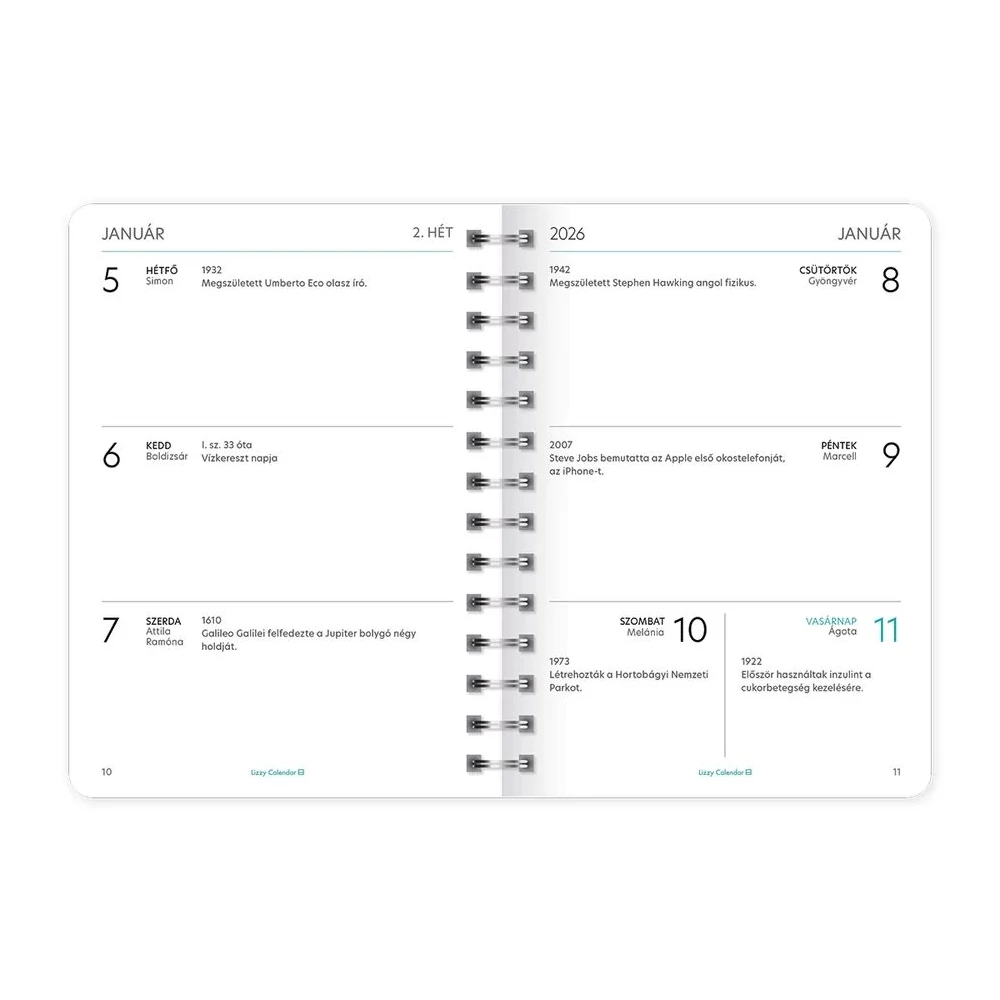 B6 méretű, spirálozott, gumipántos, heti tervező naptár, matrica oldallal, 128 +2 oldal, 118x163 mm