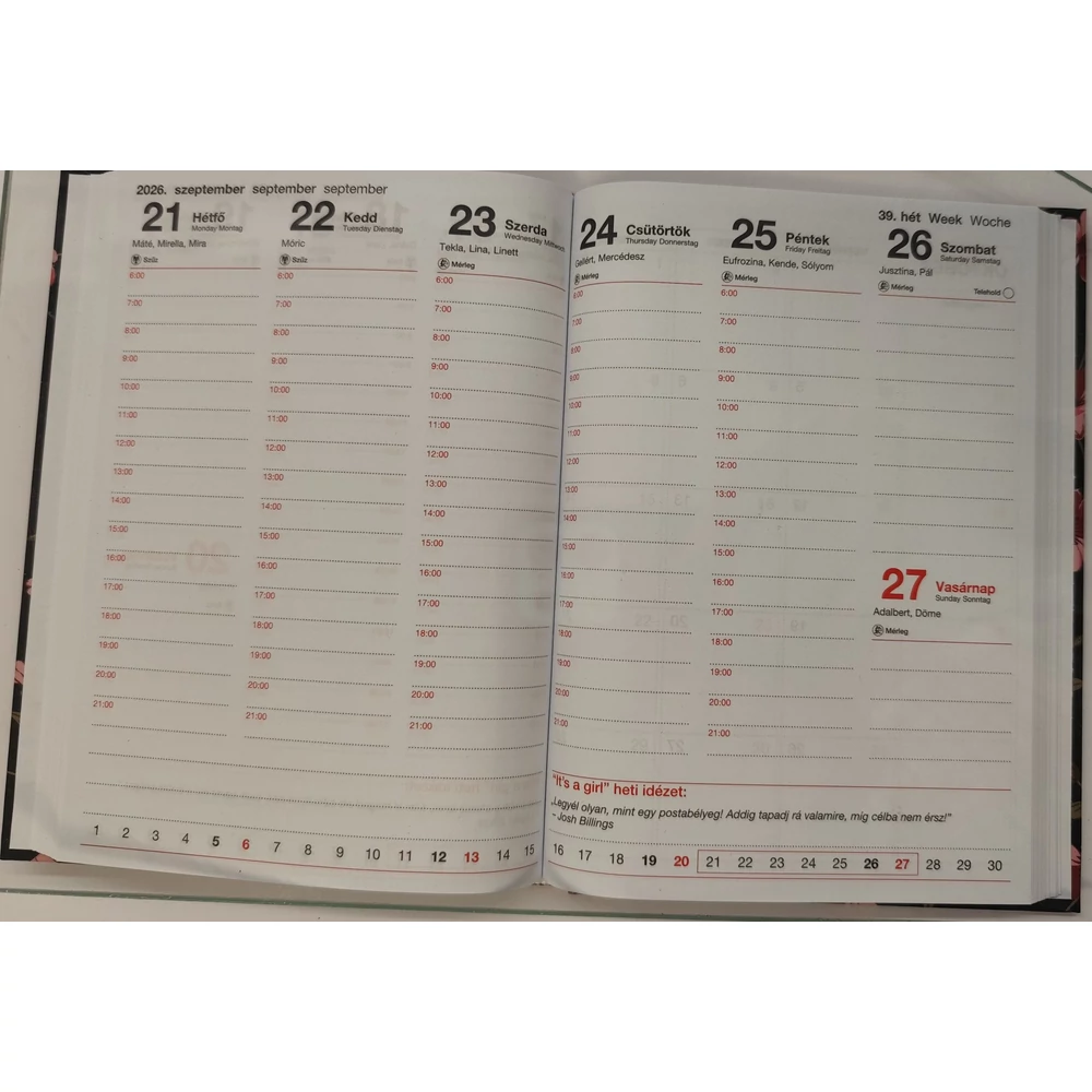 HATÁRIDŐNAPLÓ 2026 B6 heti T-Calendar It's a Girl (fehér alapon virágok)