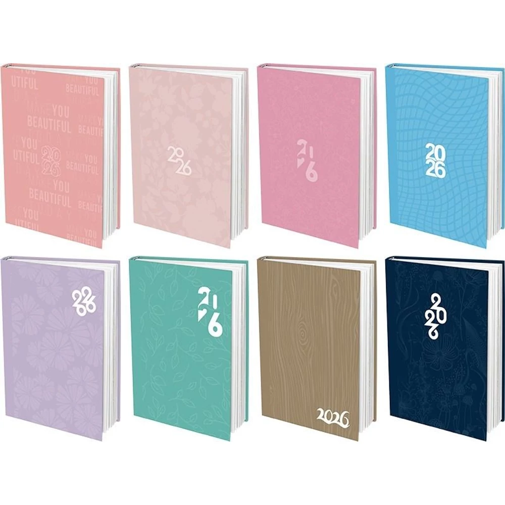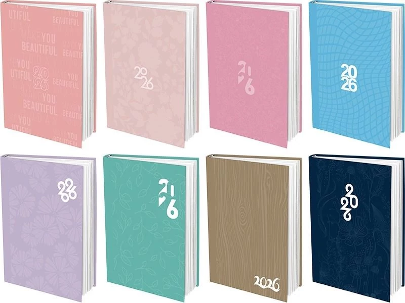 8 minta. 117x161 mm, 144 oldalas terjedelem. Beltartalom: adatlap, jegyzetek, összesítő naptár, éves tervező, magyar ünnep- és emléknapok. Naptárrész: 7 nap/oldalpár, havi bevezető, magyar névnapok, holdfázisok, magyar/angol/német, magyar ünnepnapok, 6.00-21.30 félórás beosztás. Ragasztott és cérnafűzött, 70 g-os ofszet belívek, jelzőszalag. Szivacsos tábla.