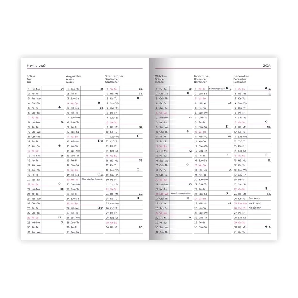 B6 méretű, keményfedeles, heti bontású tervező, heti-havi összesítővel, 144 oldal, 120x170 mm