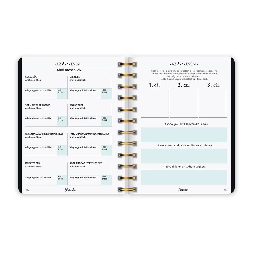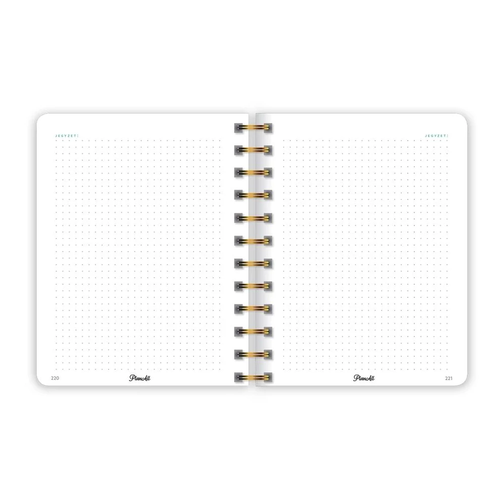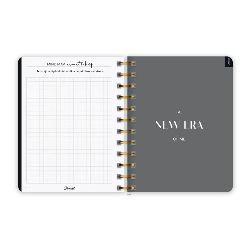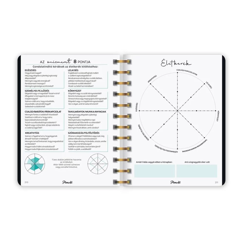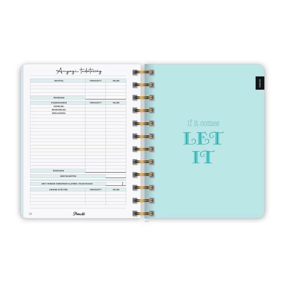 B6 méretű, spirálozott, keményfedeles, gumi rögzítős heti tervezőnaptár, mely pont elfér a retikülben! Igazi "Life Coach"! Havi, napi, éves célok, anyagi tudatosság, hangulattábla, havi szokáskövető táblázat, havi motiváció, elmetérkép, negyedéves és éves értékelők, személyes fókusz, 224 oldal, spirálozott, 12 színes havi elválasztólap, 88 matrica, Méret: 135x170 mm.