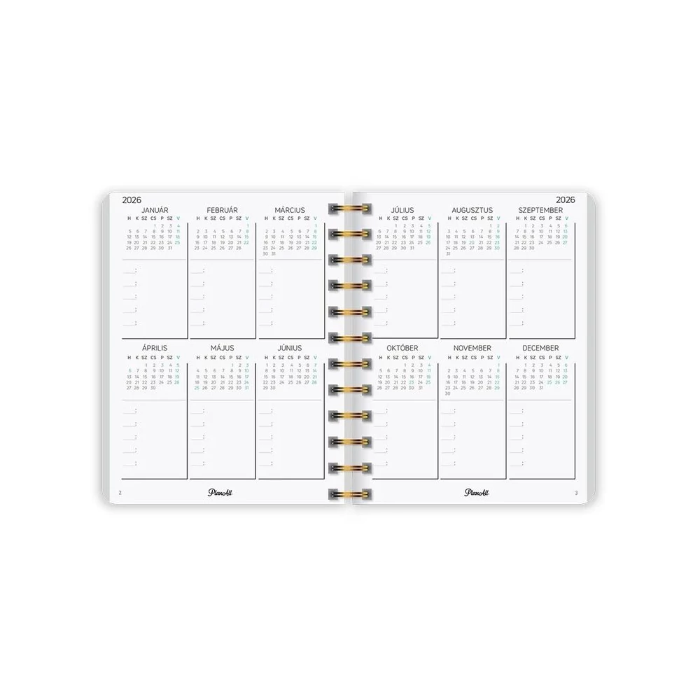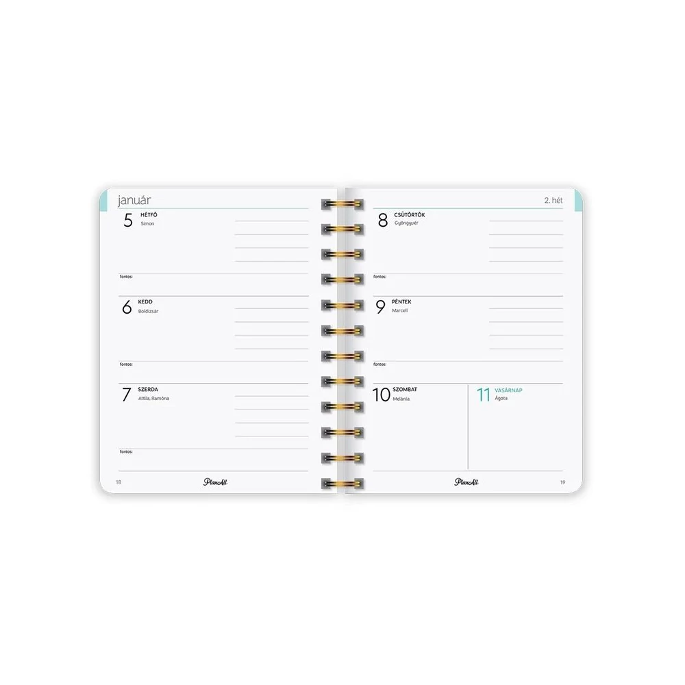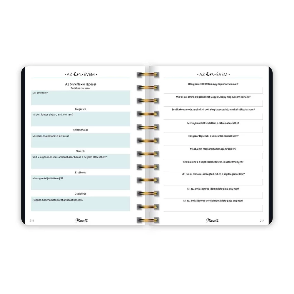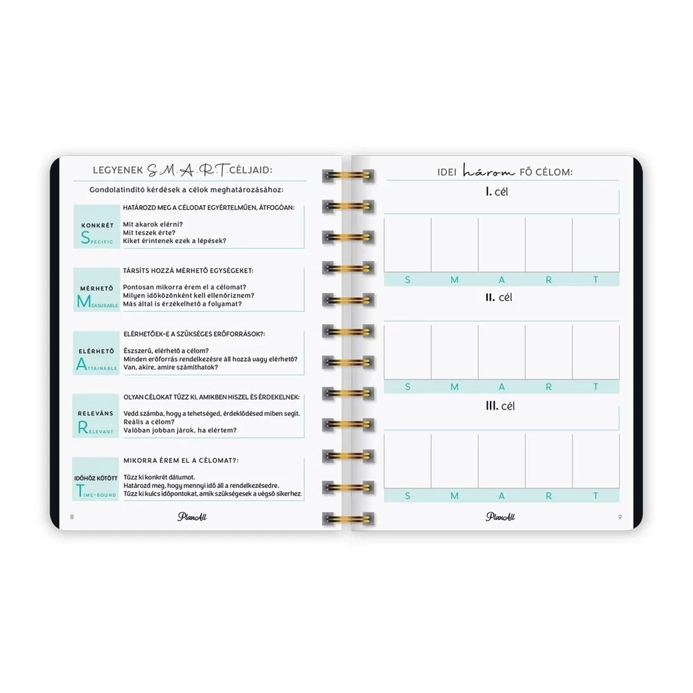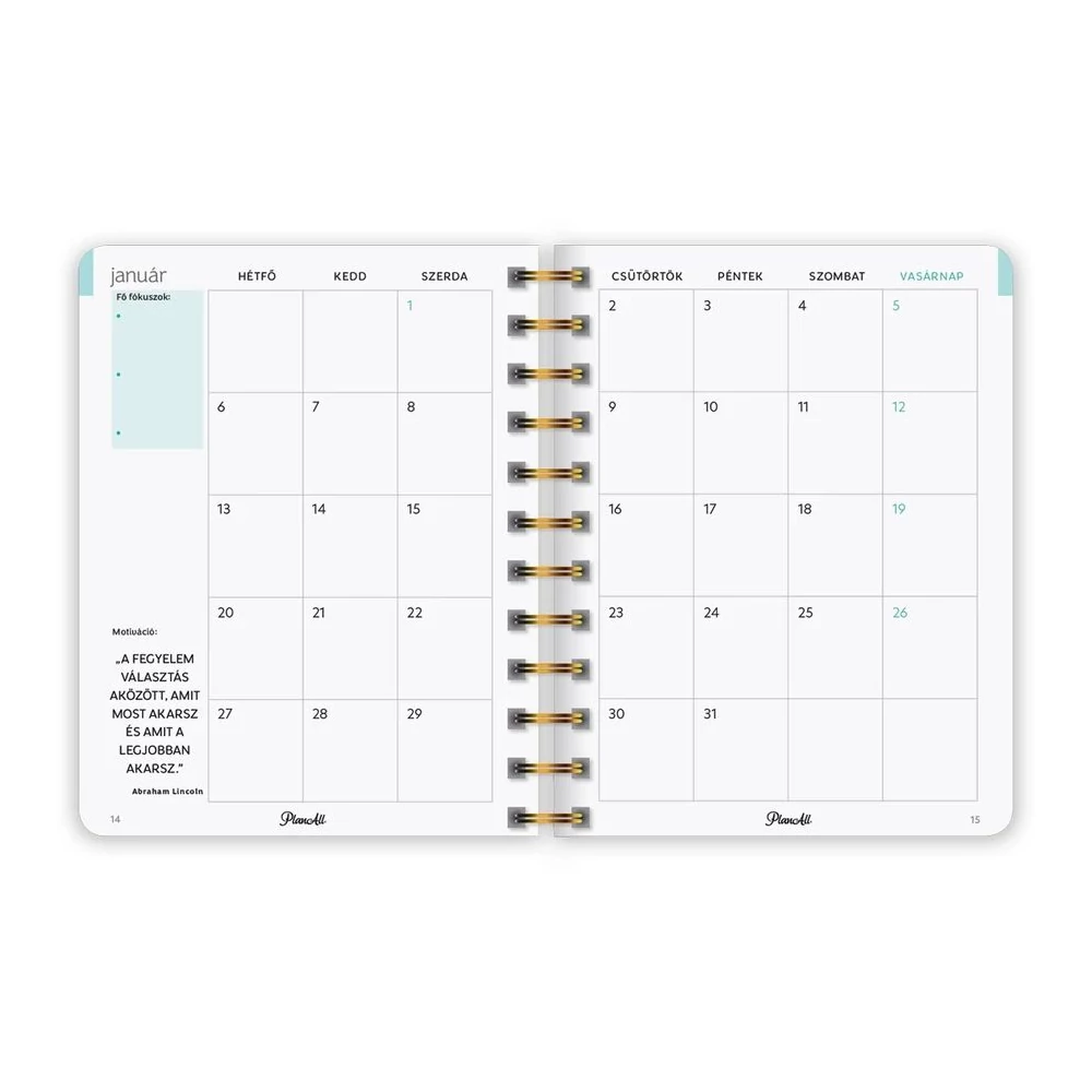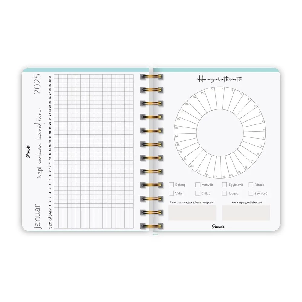 B6 méretű, spirálozott, keményfedeles, gumi rögzítős heti tervezőnaptár, mely pont elfér a retikülben! Igazi "Life Coach"! Havi, napi, éves célok, anyagi tudatosság, hangulattábla, havi szokáskövető táblázat, havi motiváció, elmetérkép, negyedéves és éves értékelők, személyes fókusz, 224 oldal, spirálozott, 12 színes havi elválasztólap, 88 matrica, Méret: 135x170 mm.