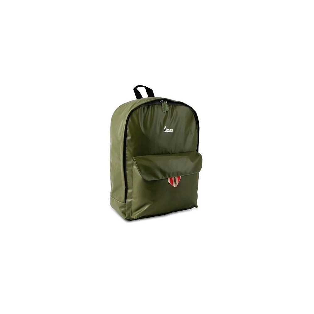 Vespa hátizsák, olívazöld poliészter TPE anyagból, fém márkajelvénnyel. A fő rekesz esővédővel ellátott, kétirányú fém cipzárral nyílik. Elülső oldalán található egy zseb, mely szintén esővédővel ellátott, tépőzárral nyílik. Hátrésze és vállpántjai párnázottak. Belül található egy cipzáras zseb,a hátizsák belseje nylonnal bélelt. Mérete:32x14x42 cm, űrtartalom: 23 l
